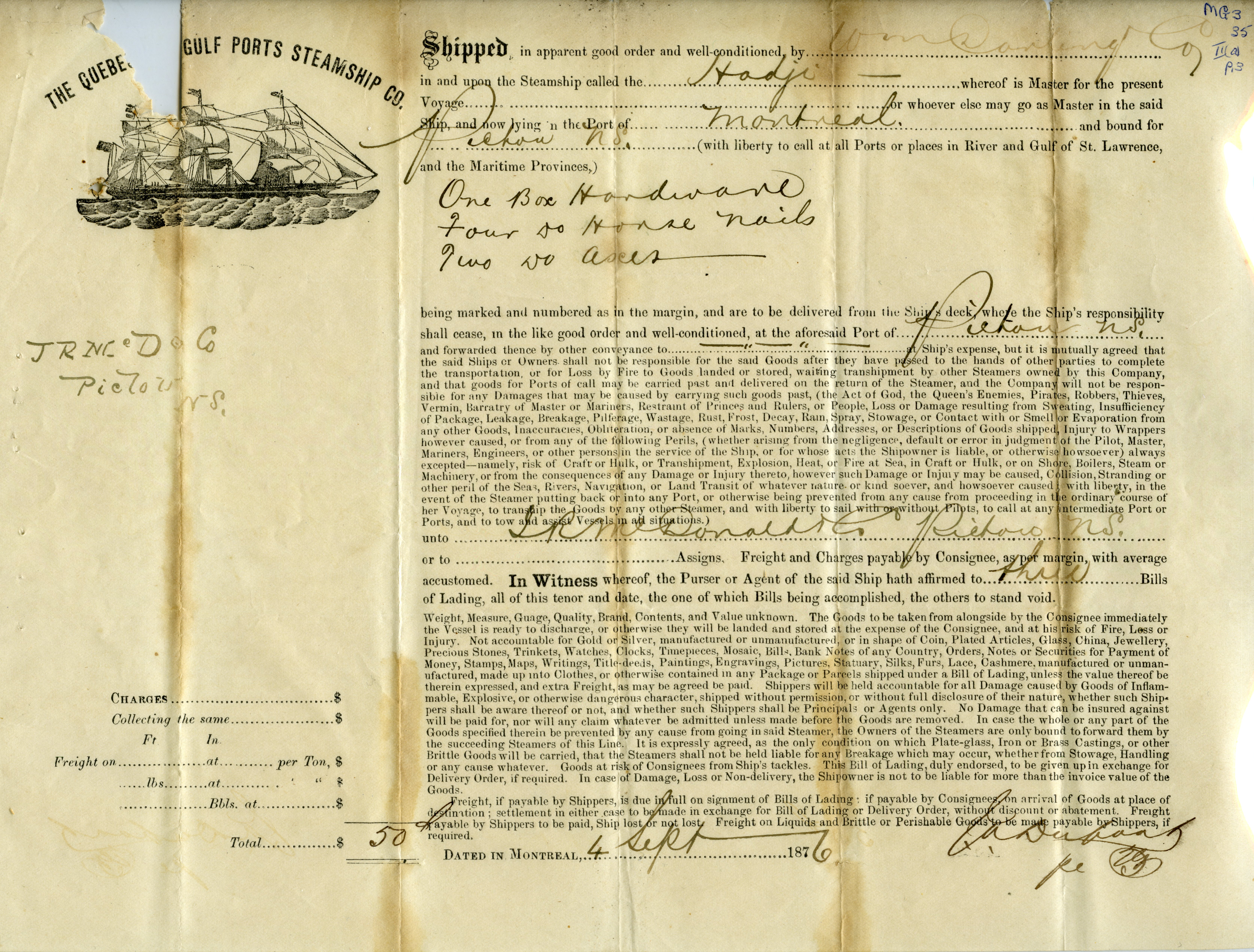 Bill of Lading from William Darling concerning a shipment of hardwar, nails, and axes from Montreal aboard the Hadje heading for Pictou for J. R. McDonald. Dated in Montreal 4 September 1876.