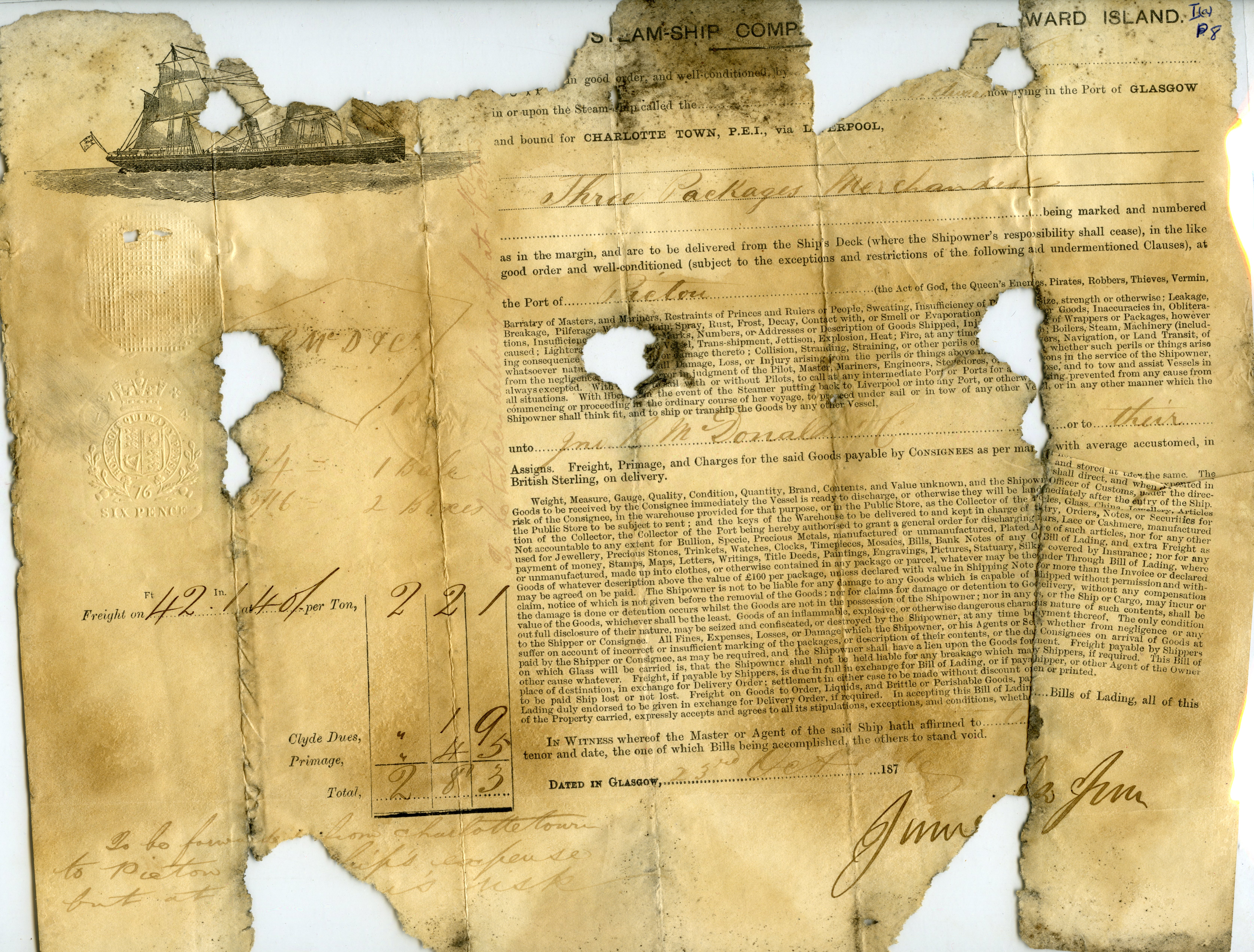 Bill of Lading from the Ocean Steamship Company of Prince Edward Island for John R. McDonald & Company in Pictou, for a shipment of merchandise arriving in Pictou from Glasgow via Charlottetown. Dated in Glasgow 23rd October 1876.