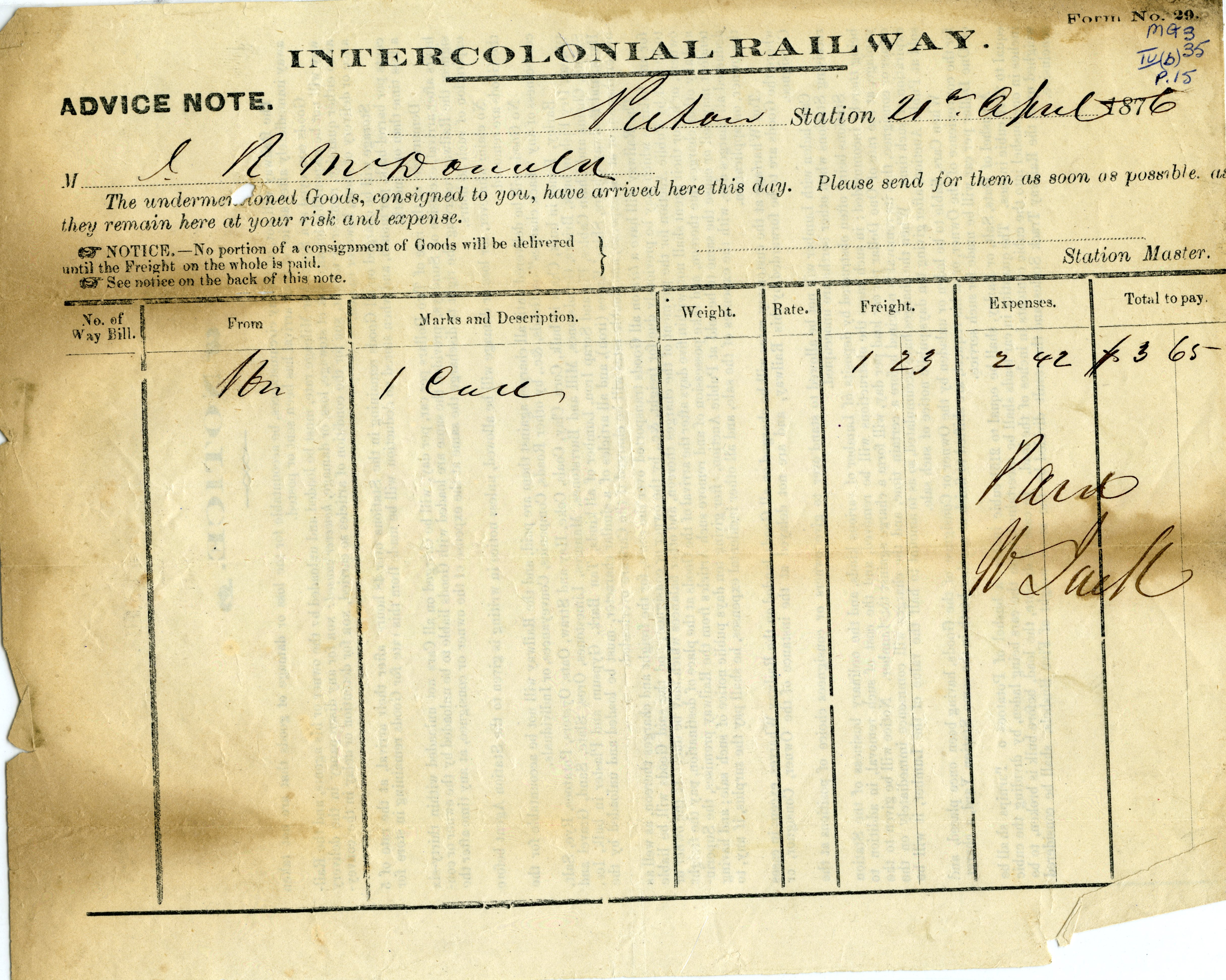 | Tags: | John R. McDonald, Pictou, Intercolonial Railway, railway, advice note, freight, ICR |