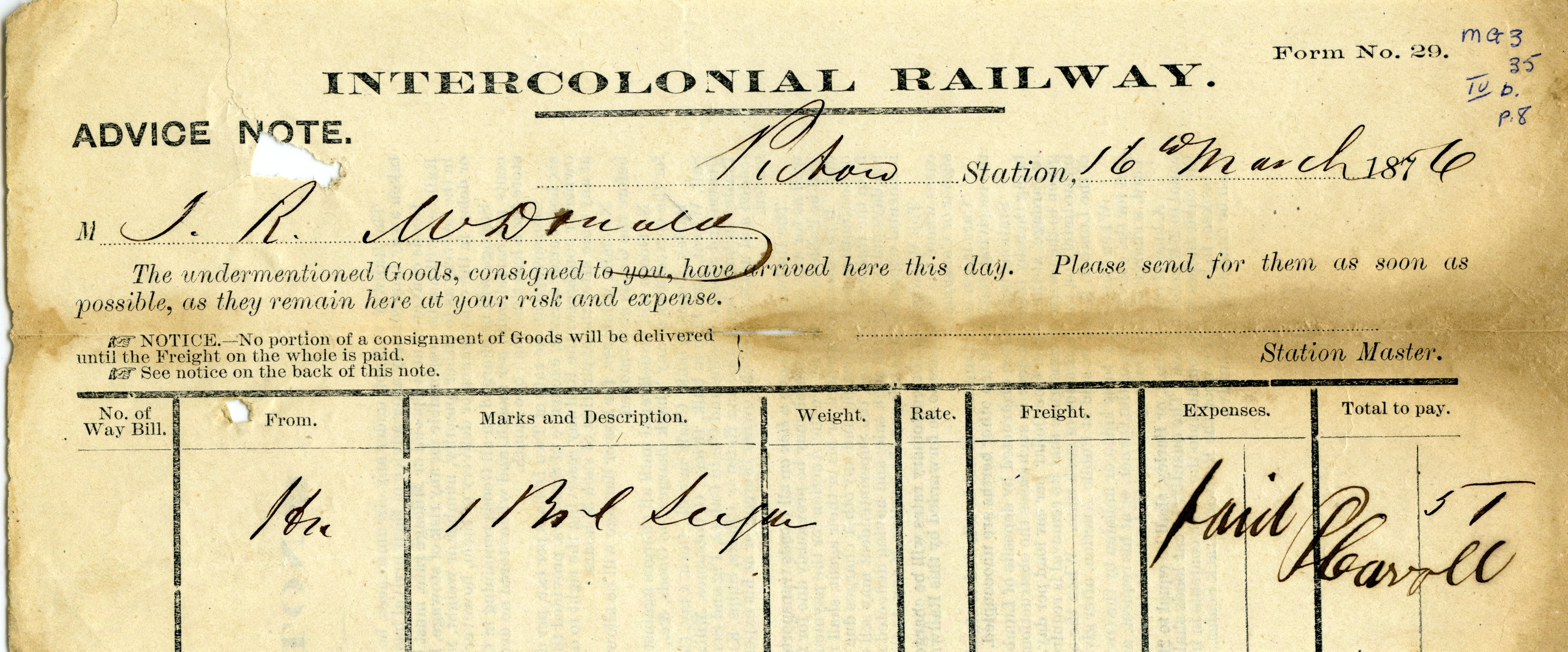 | Tags: | Intercolonial Railway, John R. McDonald, Pictou, railway, advice note, freight, ICR |