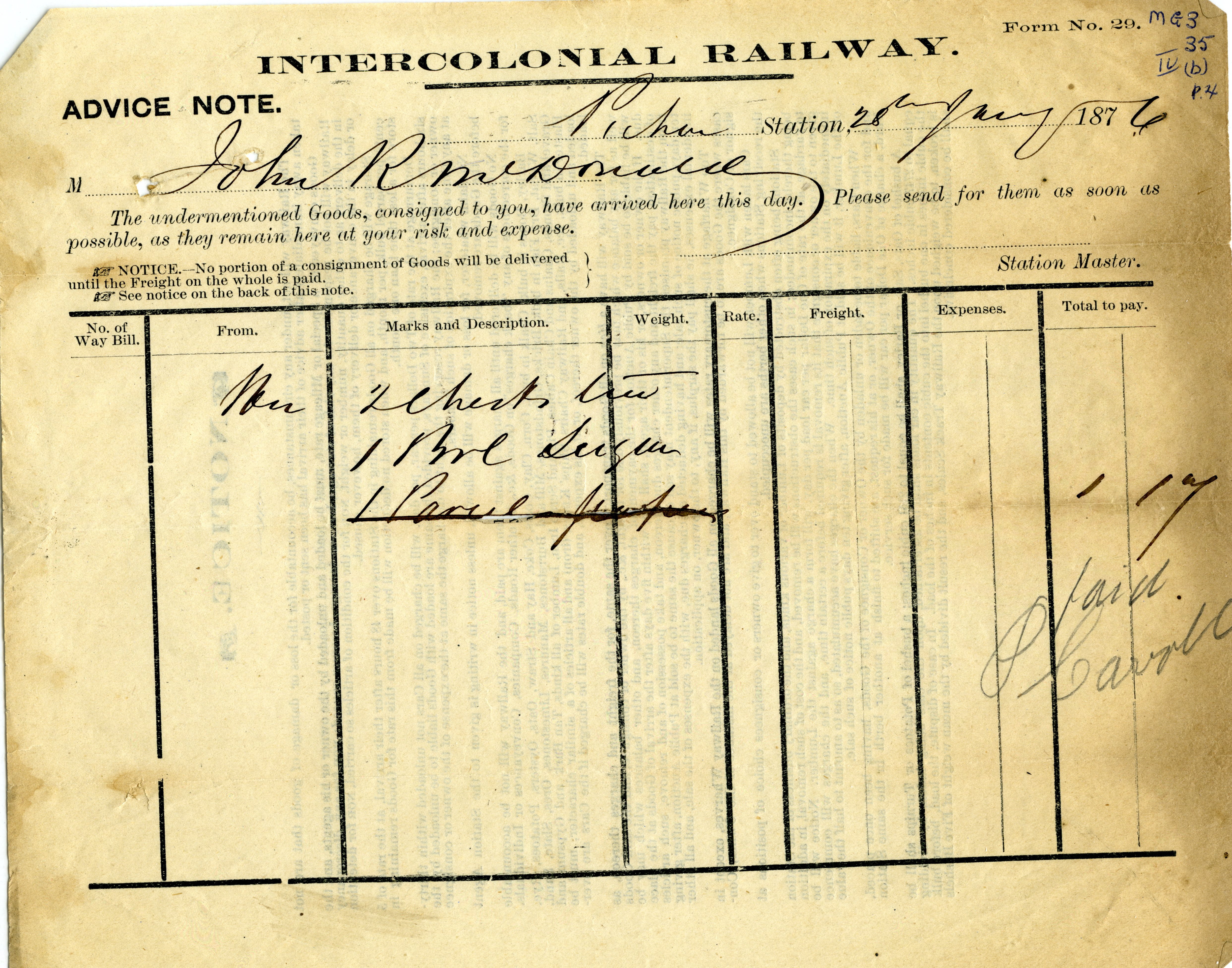 | Tags: | Intercolonial Railway, railway, advice note, John R. McDonald, freight, Pictou, ICR |