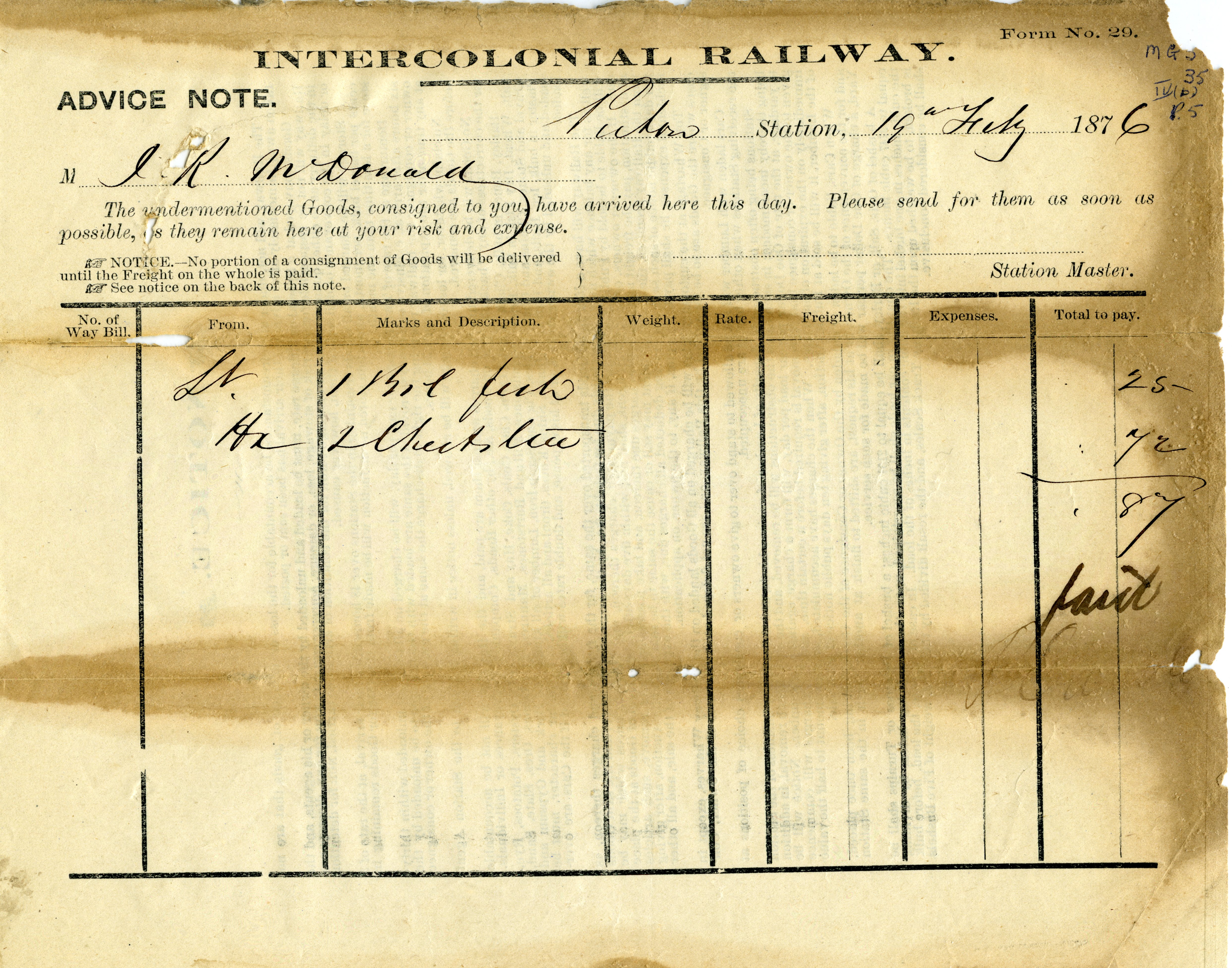 | Tags: | John R. McDonald, Intercolonial Railway, railway, advice note, freight, Pictou, Halifax, ICR |