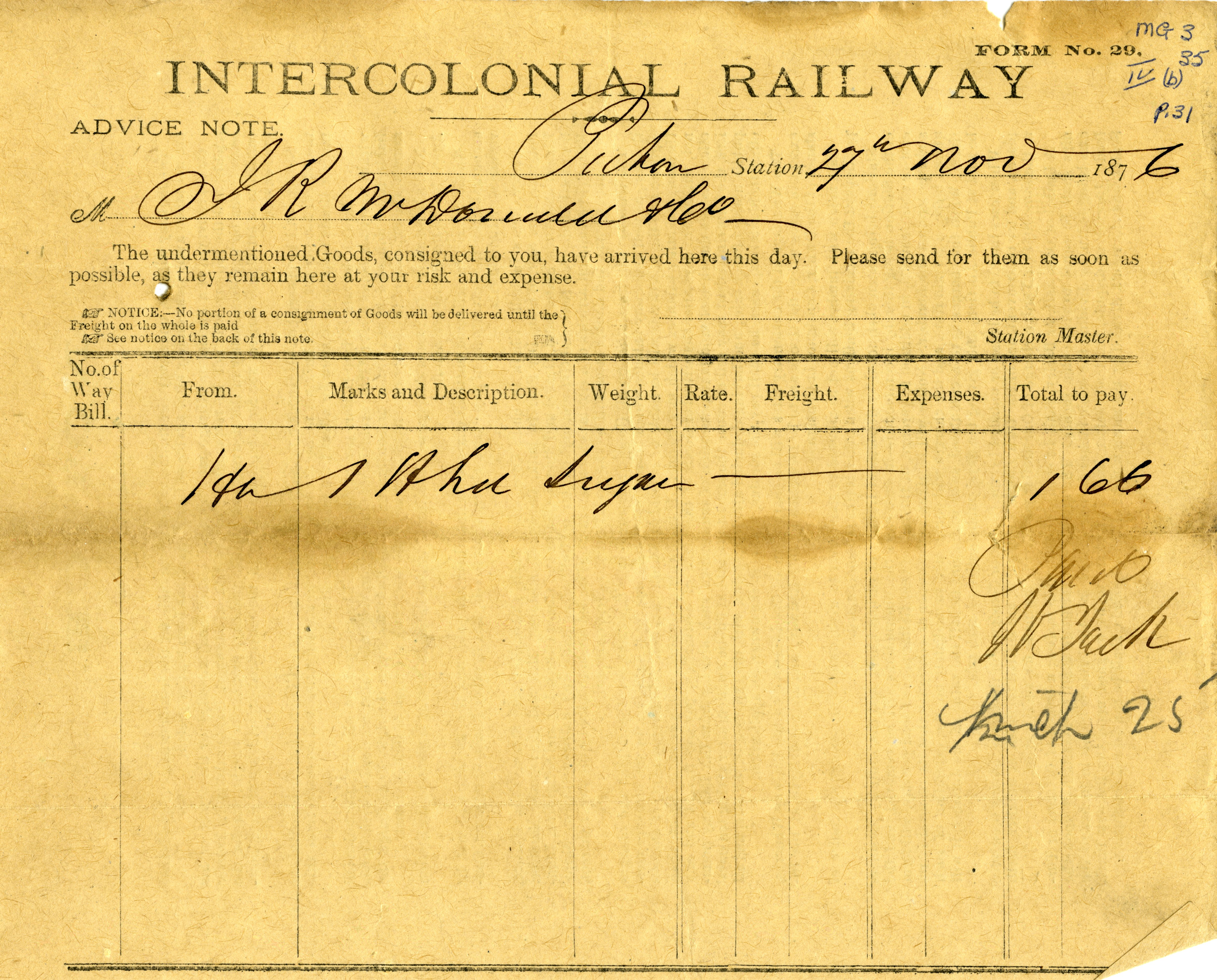 | Tags: | advice note, John R. McDonald, Pictou, Intercolonial Railway, railway, freight, ICR |