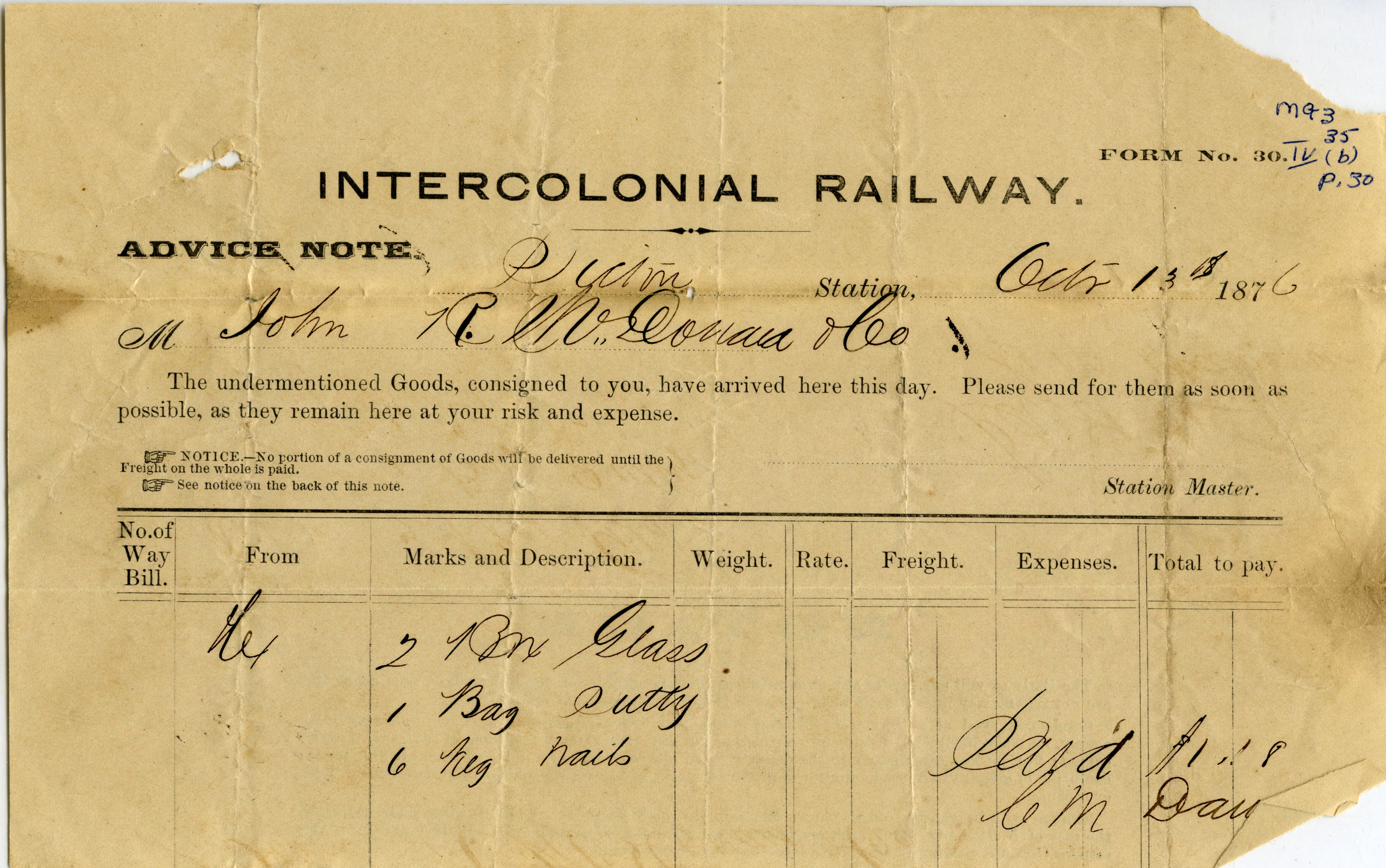 | Tags: | John R. McDonald, Pictou, Intercolonial Railway, railway, freight, advice note, ICR |