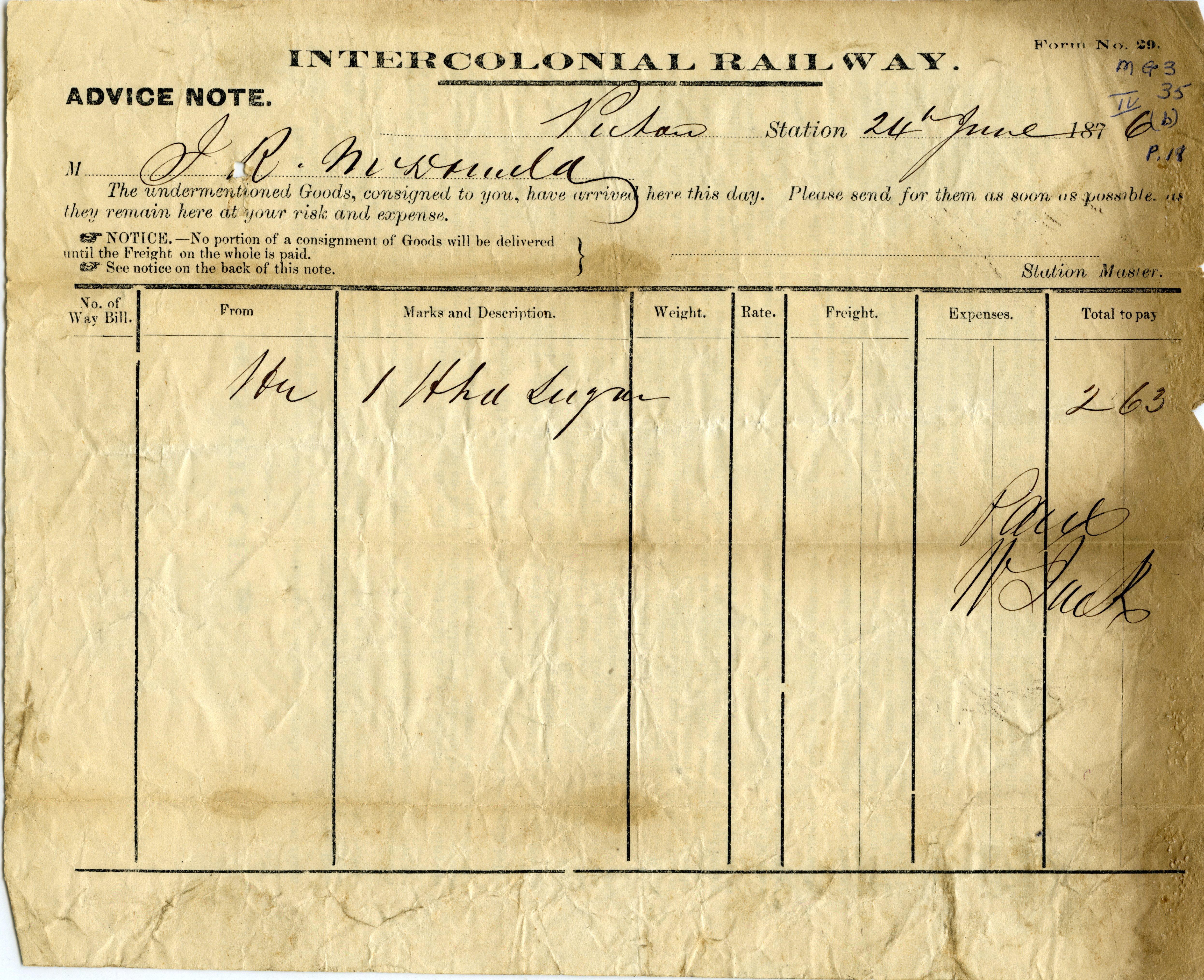 | Tags: | John R. McDonald, Pictou, Intercolonial railway, railway, ICR, freight, advice note |