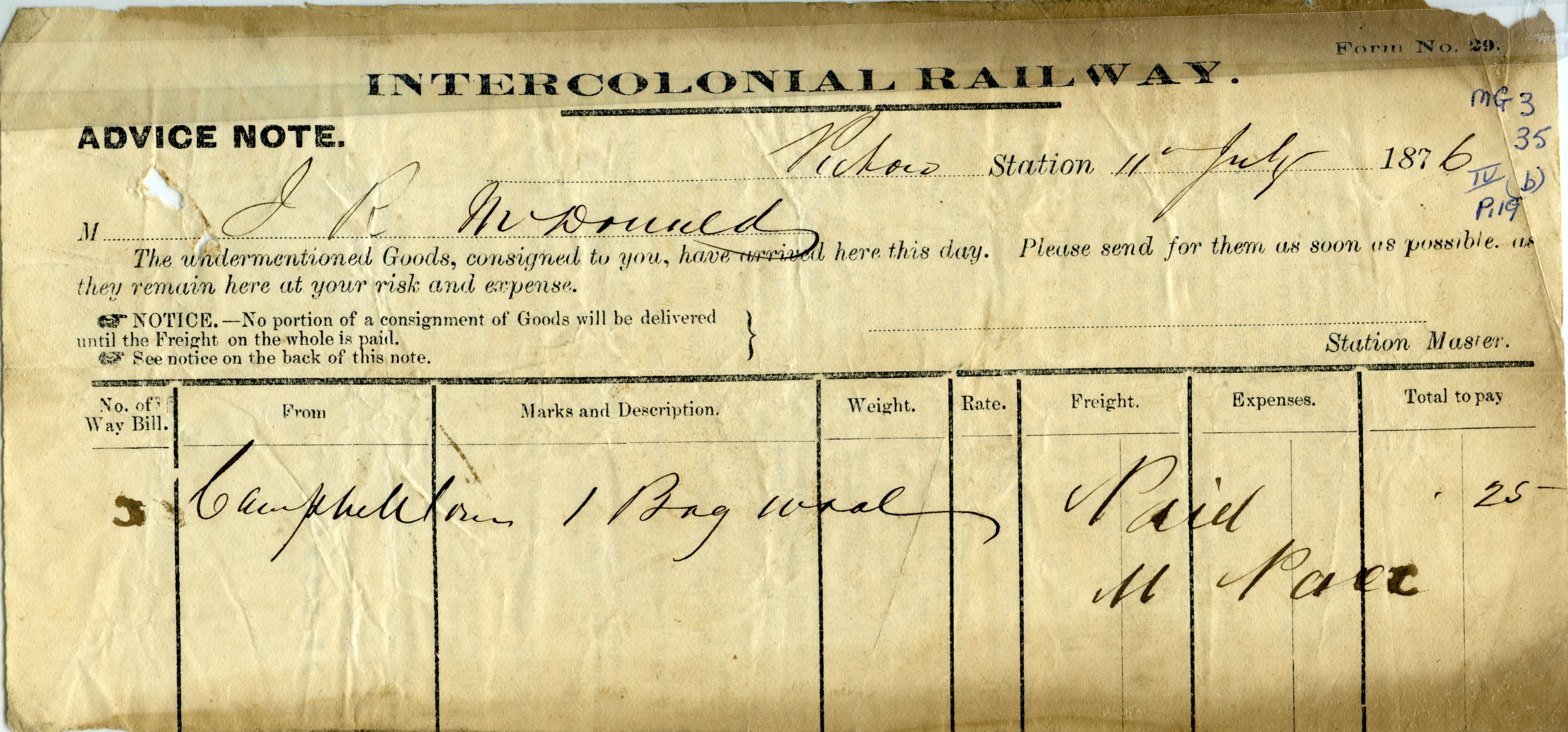 | Tags: | John R. McDonald, Pictou, Intercolonial Railway, railway, freight, ICR, advice note |
