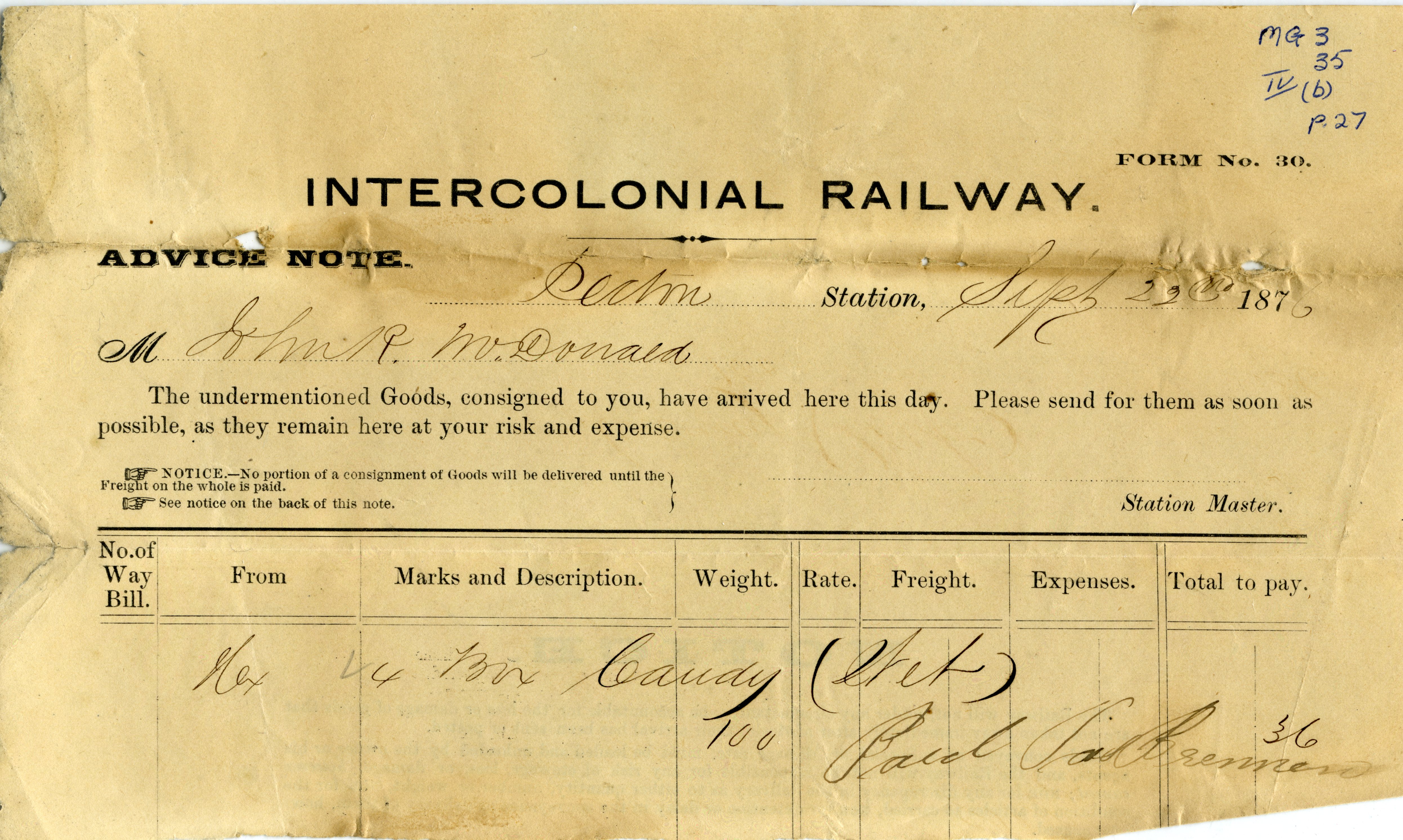 | Tags: | John R. McDonald, Pictou, Intercolonial Railway, railway, ICR, freight, advice note |