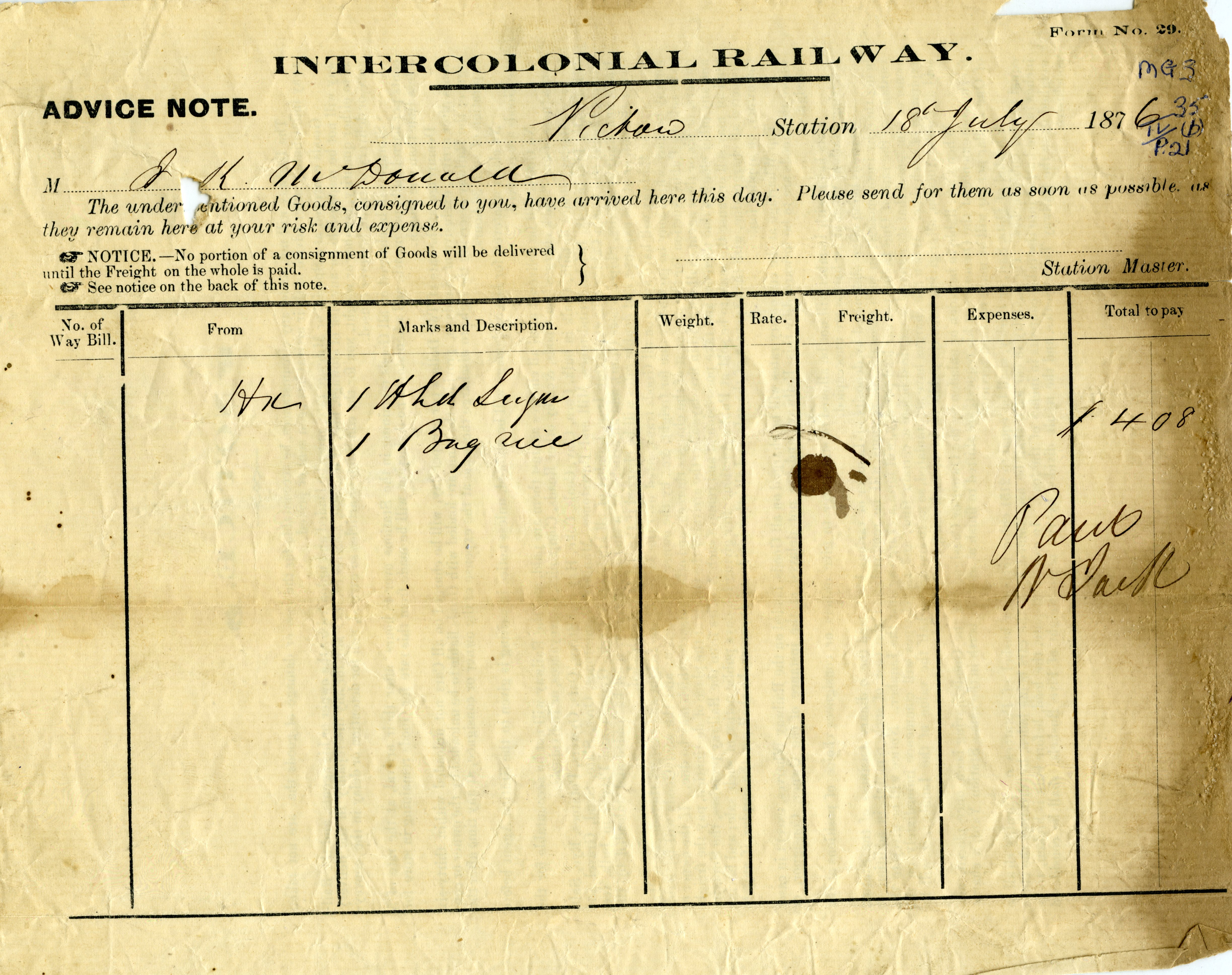 | Tags: | John R. McDonald, Pictou, Intercolonial Railway, railway, ICR, freight, advice note |