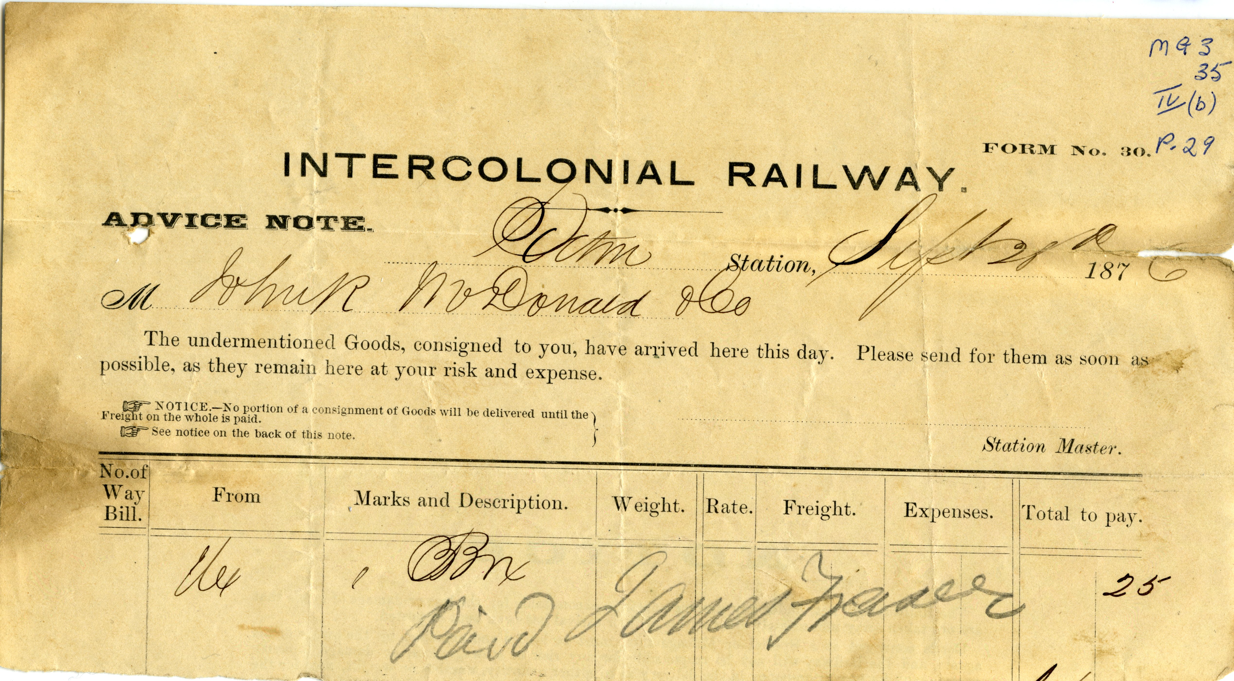 | Tags: | John R. McDonald, Pictou, ICR, Intercolonial Railway, railway, freight, advice note |