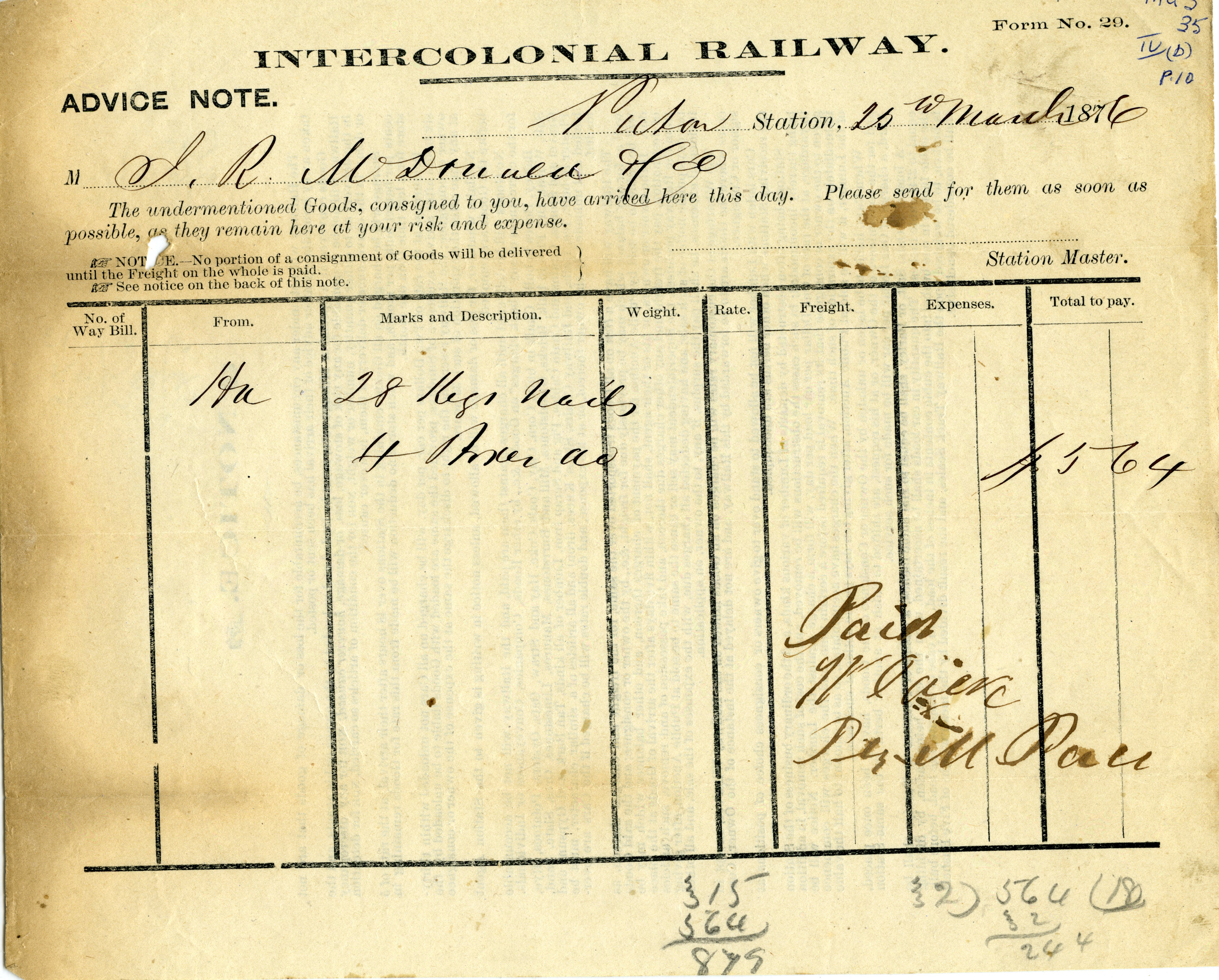 | Tags: | John R. McDonald, Pictou, Intercolonial Railway, railway, ICR, advice note, freight |