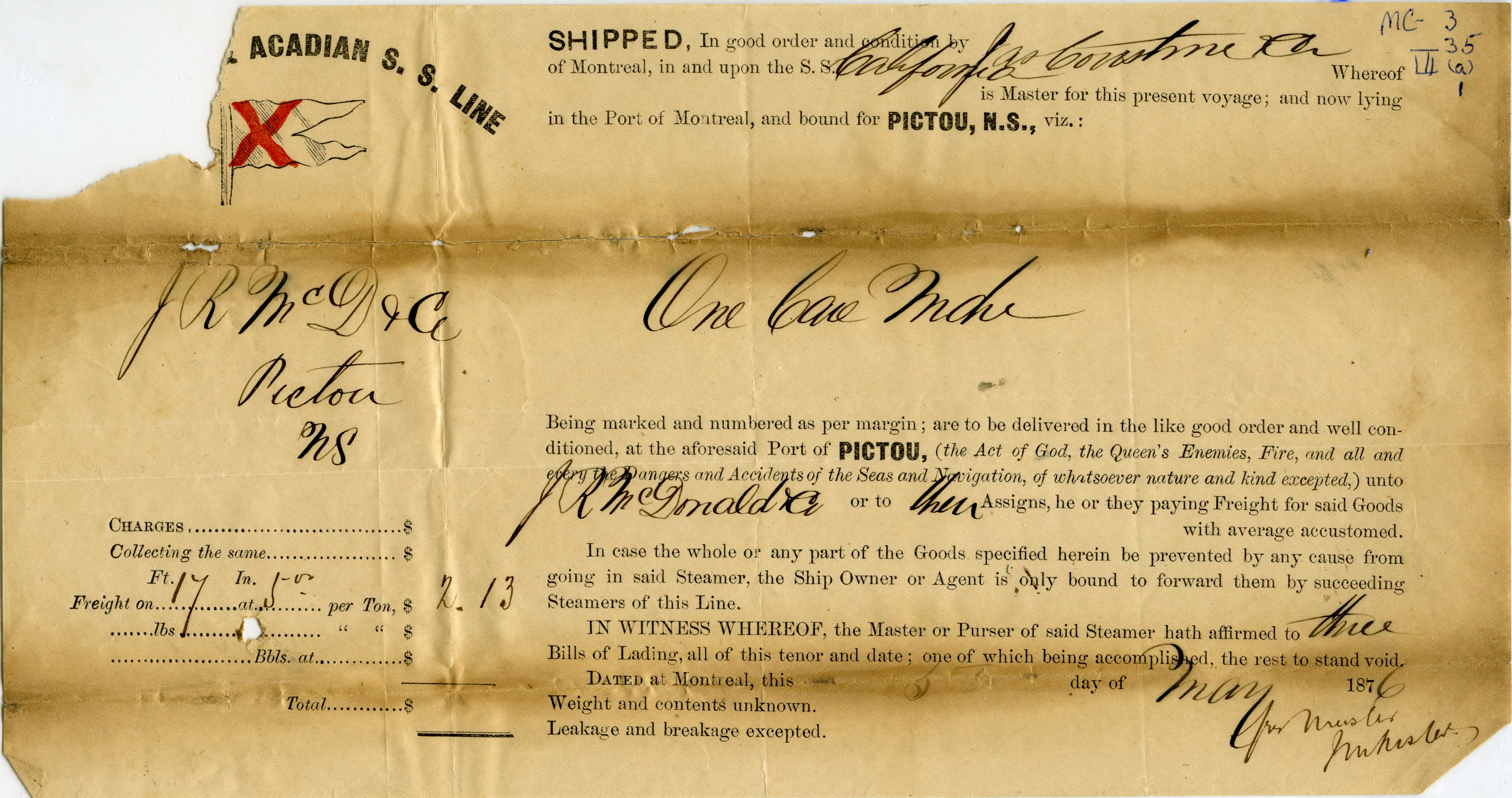 Bill of Lading for J. R. McDonald Company in Pictou for cargo on the S.S. California leaving from Montreal, dated May 5th, 1876.
