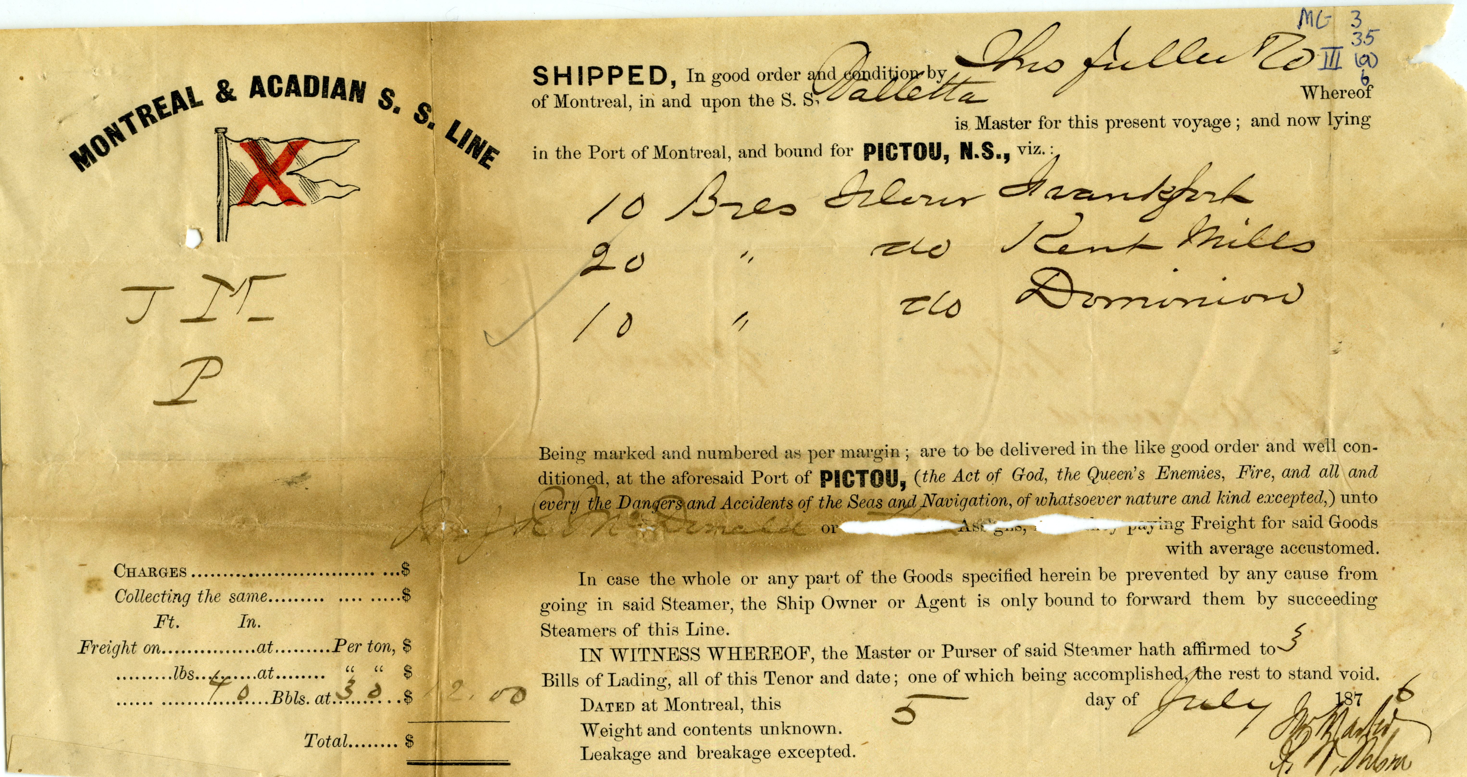 Bill of Lading for J. R. McDonald, Pictou, for flour aboard the Valletta, from Thomas Fuller & Co., dated July 5th, 1876 in Montreal.