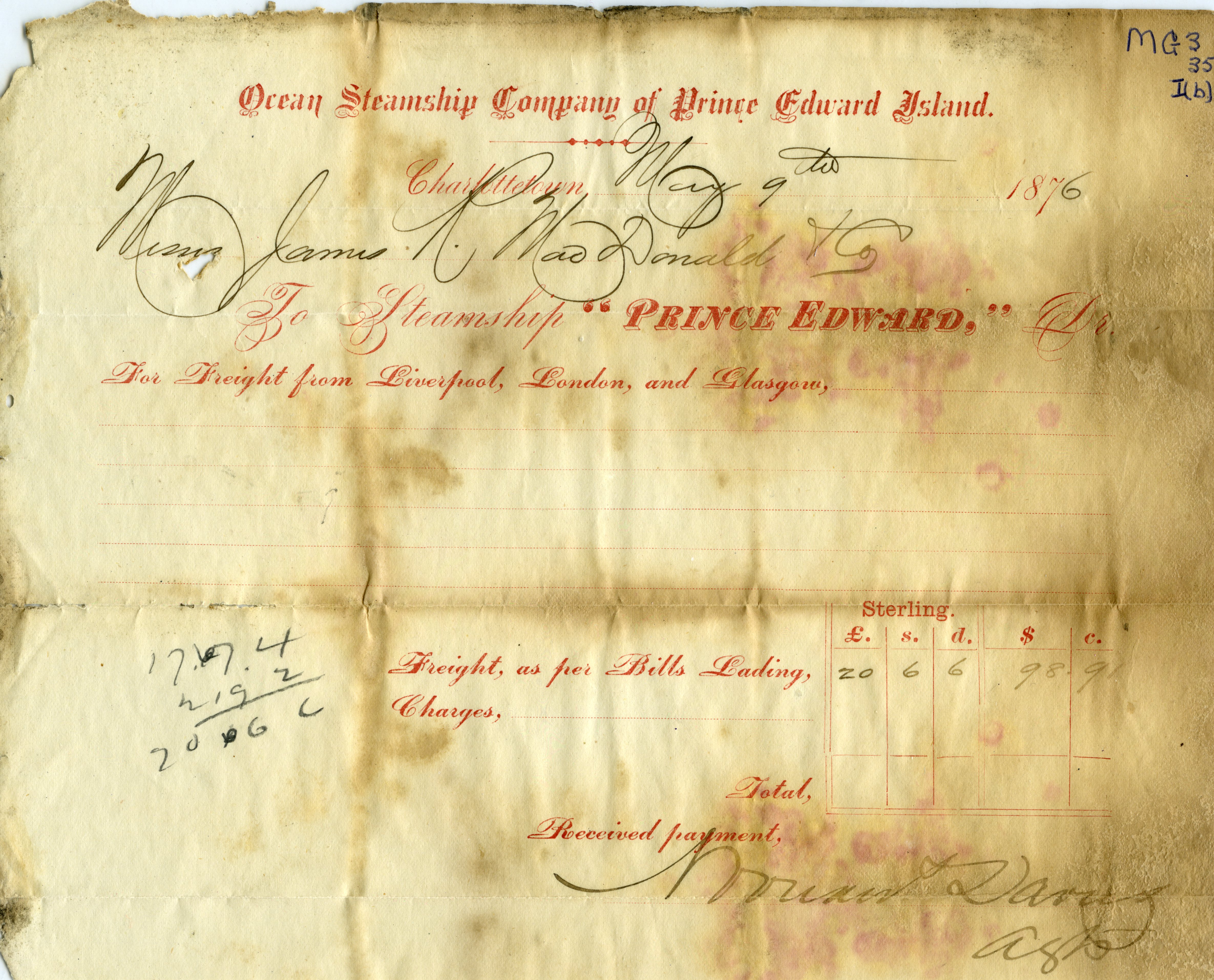 | Tags: | Ocean Steamship Company of Prince Edward Island, John R. McDonald, Pictou, Charlottetown, freight, invoice, shipping |