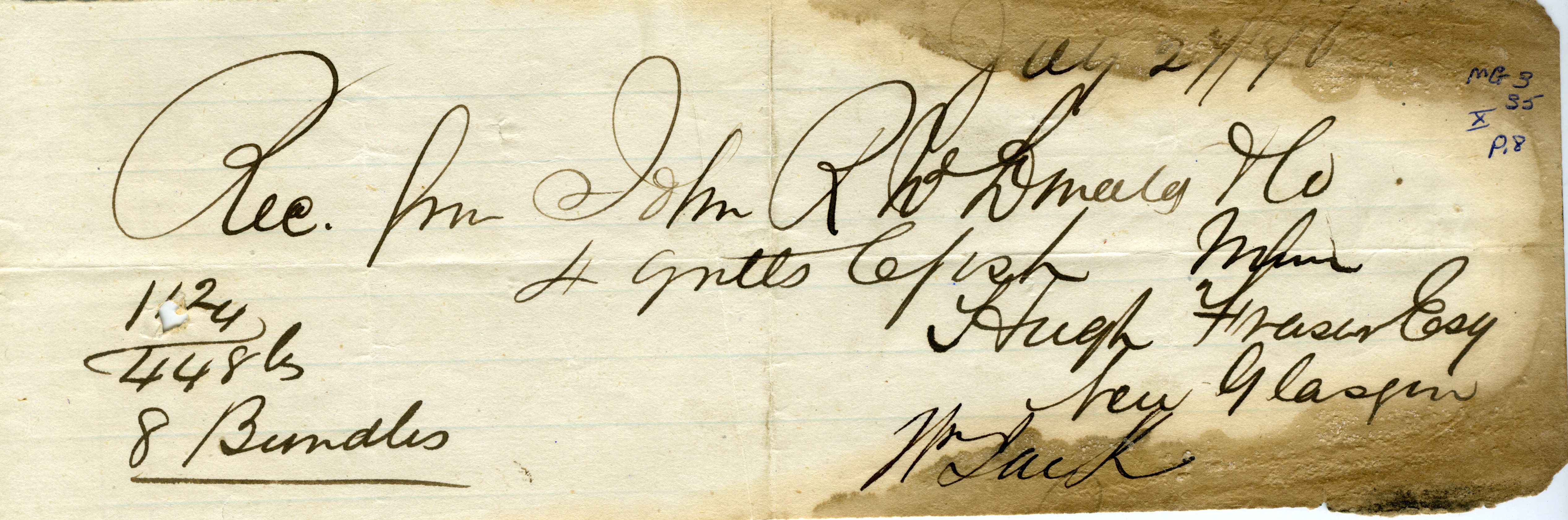 | Tags: | John R. McDonald, William Jack, Hugh Fraser, New Glasgow, Pictou, note, receipt |