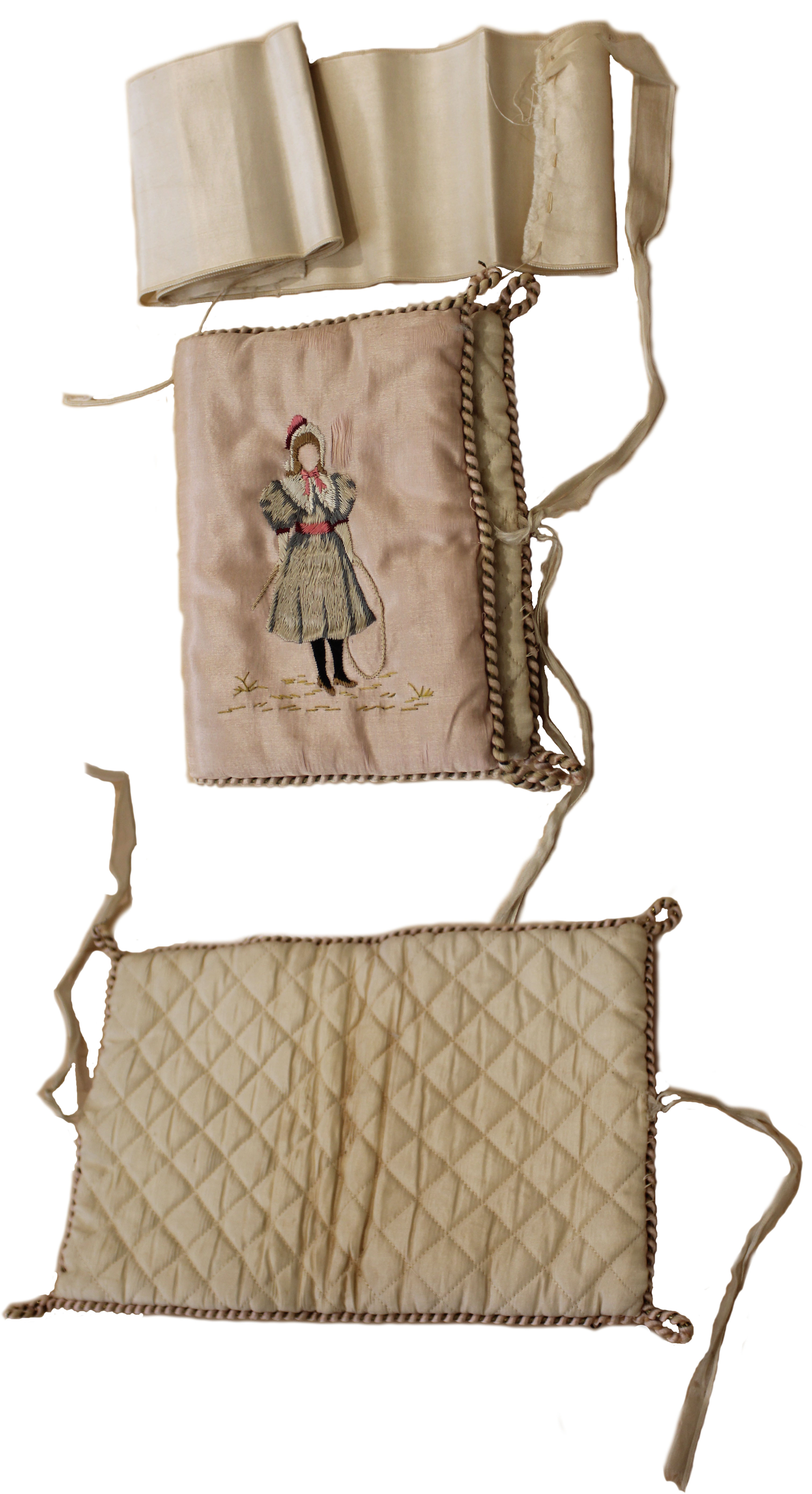 Embroidered bookbinding using satin stitch to depict a facless girl holding a hoop and stick. Belonged to the Tattrie family of River John.