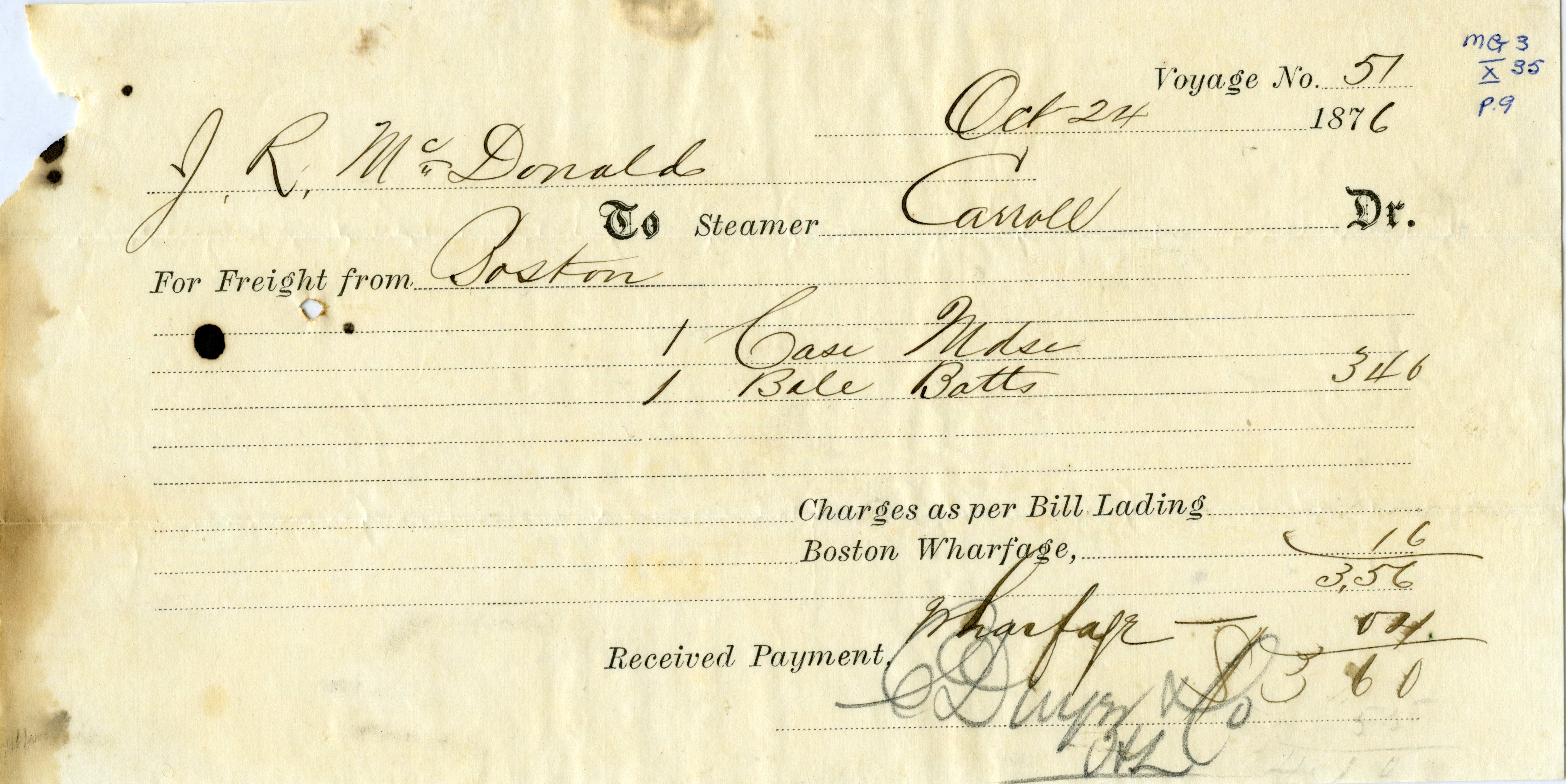 | Tags: | John R. McDonald, Boston, Pictou, note, receipt, Carroll |