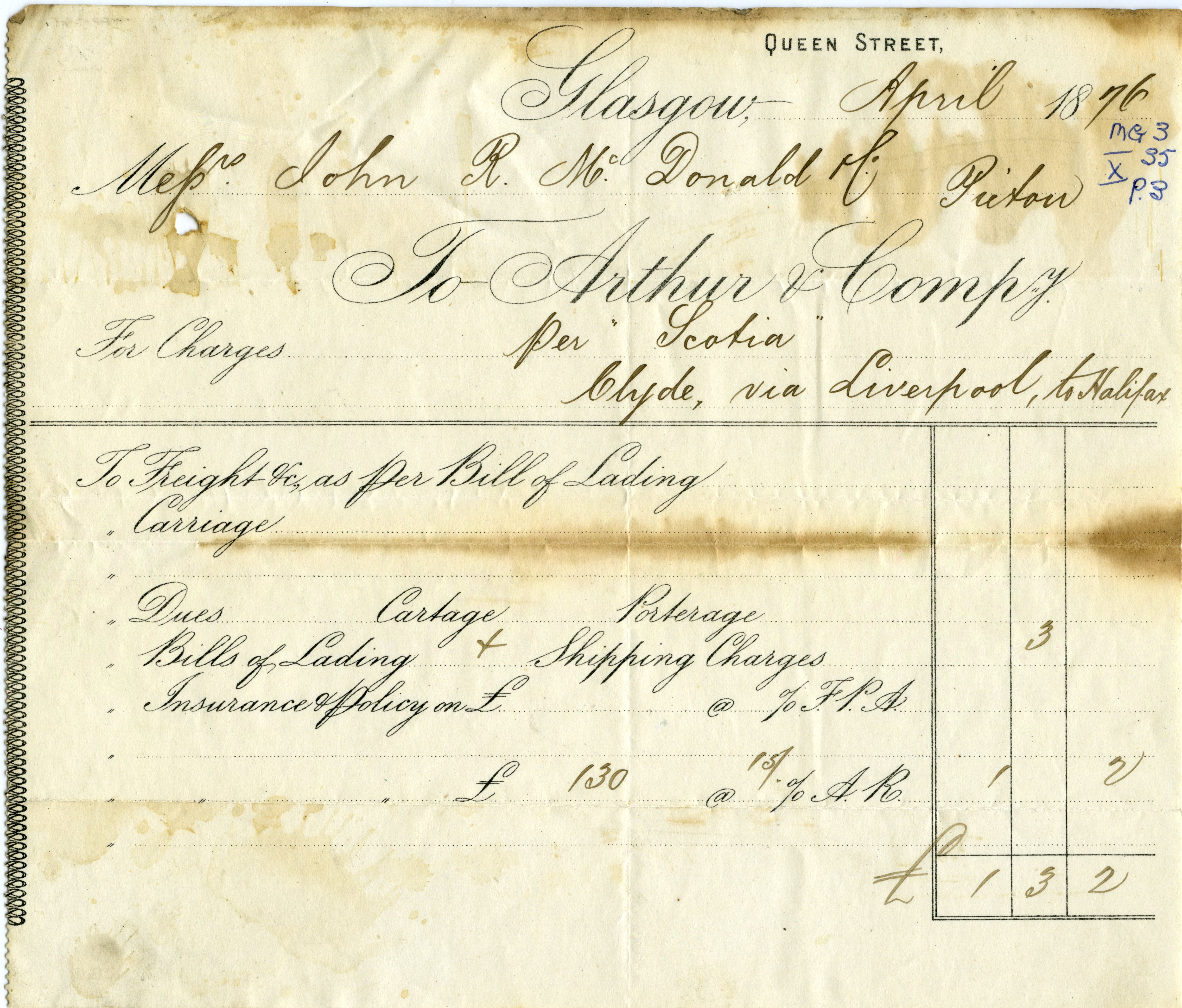 | Tags: | John R. McDonald, invoice, Glasgow, Arthur & Company, Pictou |