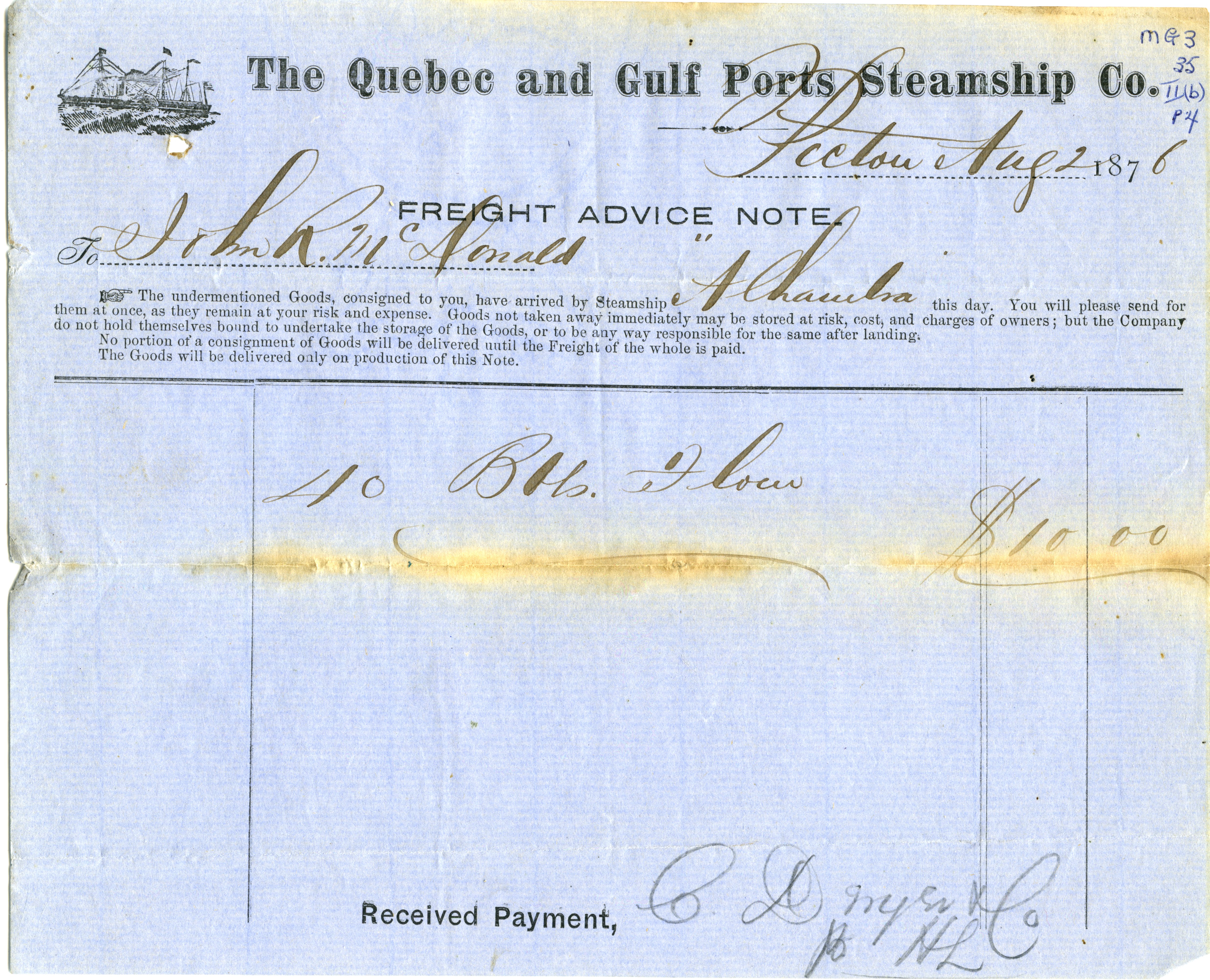 | Tags: | John R. McDonald, Quebec and Gulf Ports Steamship Company, freight advice note, advice note, freight, Pictou, Alhambra |