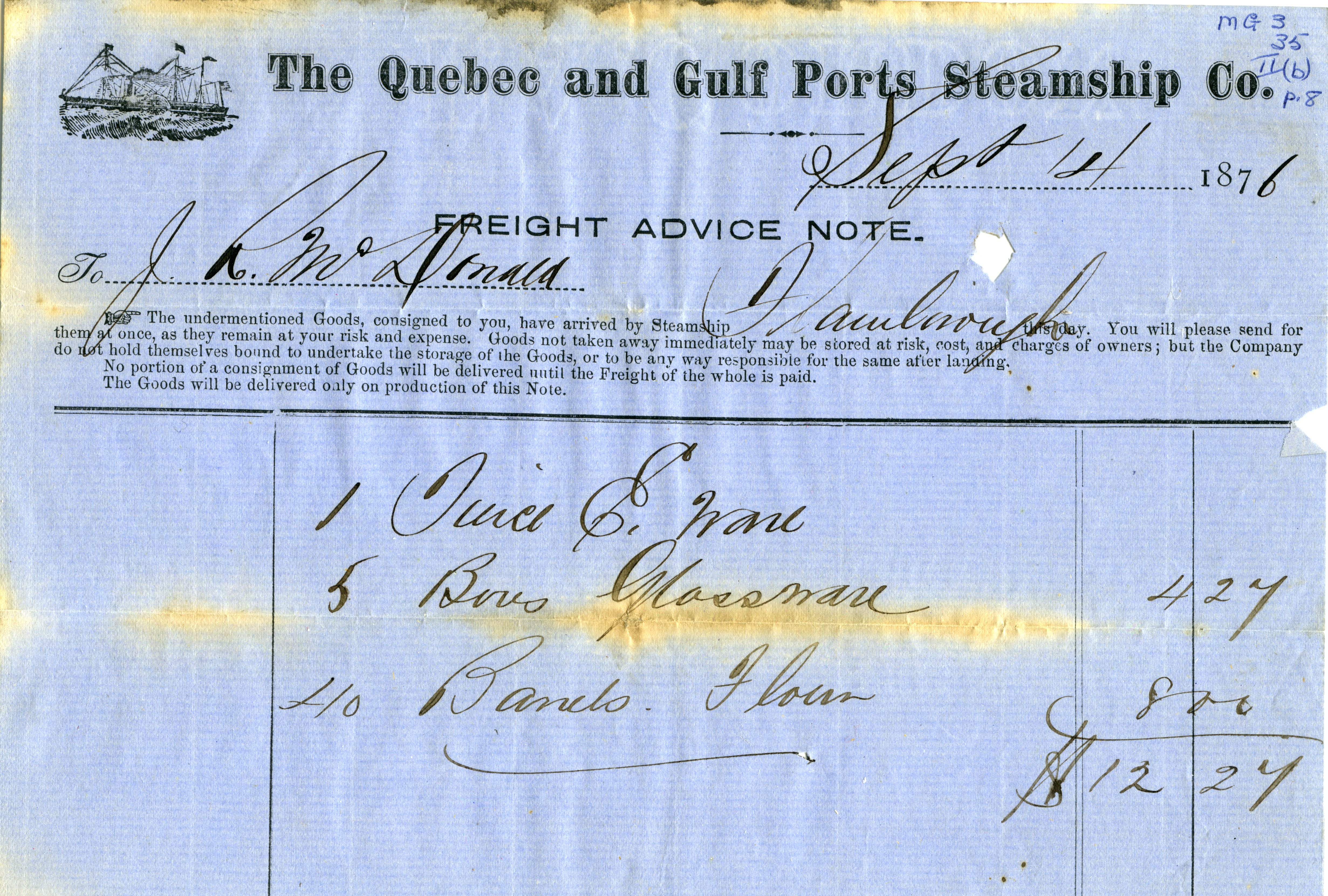 | Tags: | John R. McDonald, Pictou, Hamborough, Quebec and Gulf Ports Steamship Company, freight, advice note |