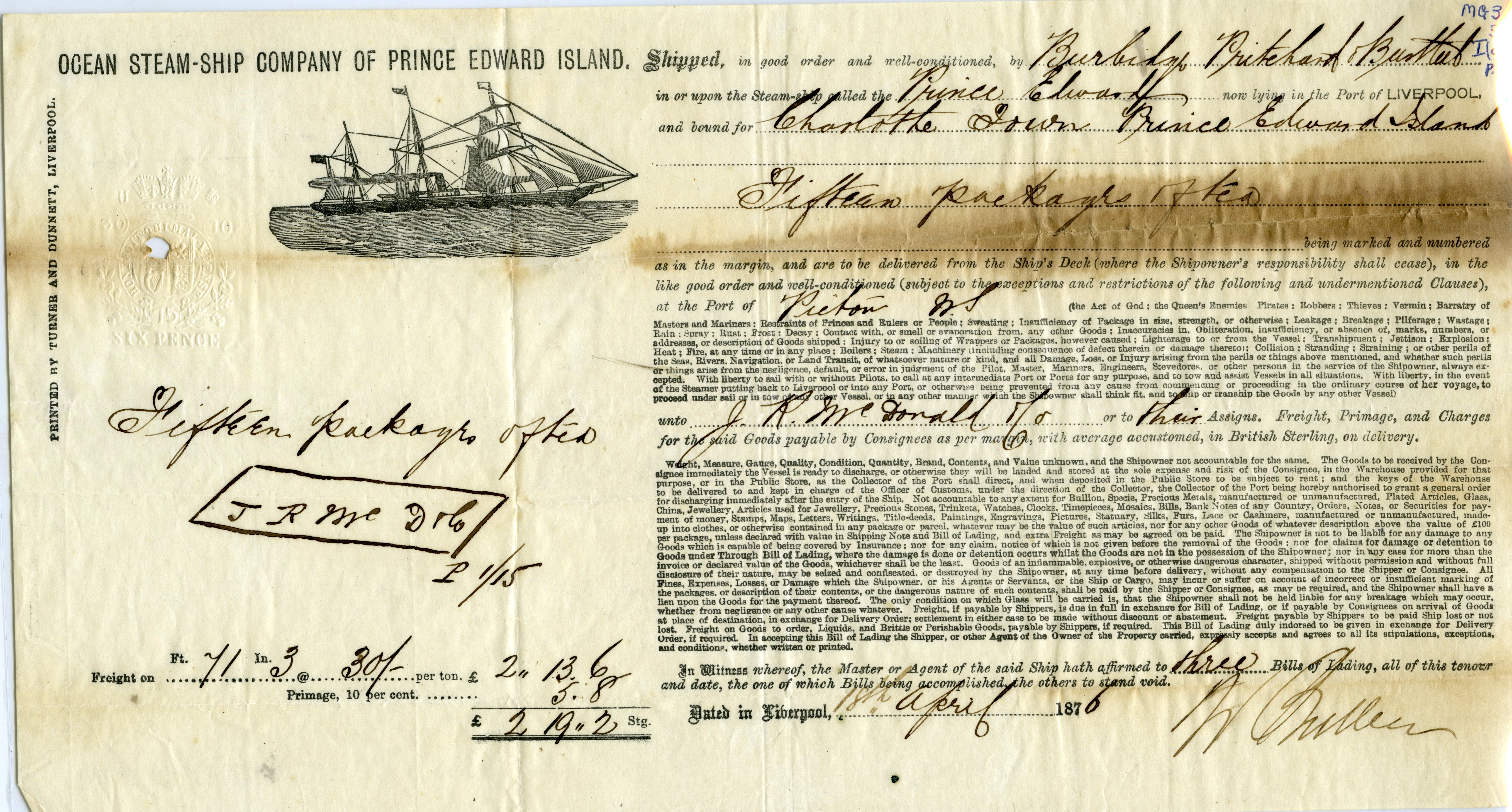 Dated April 18th, 1876 for J. R. McDonald & Co., Pictou for a shipment aboard the Prince Edward
