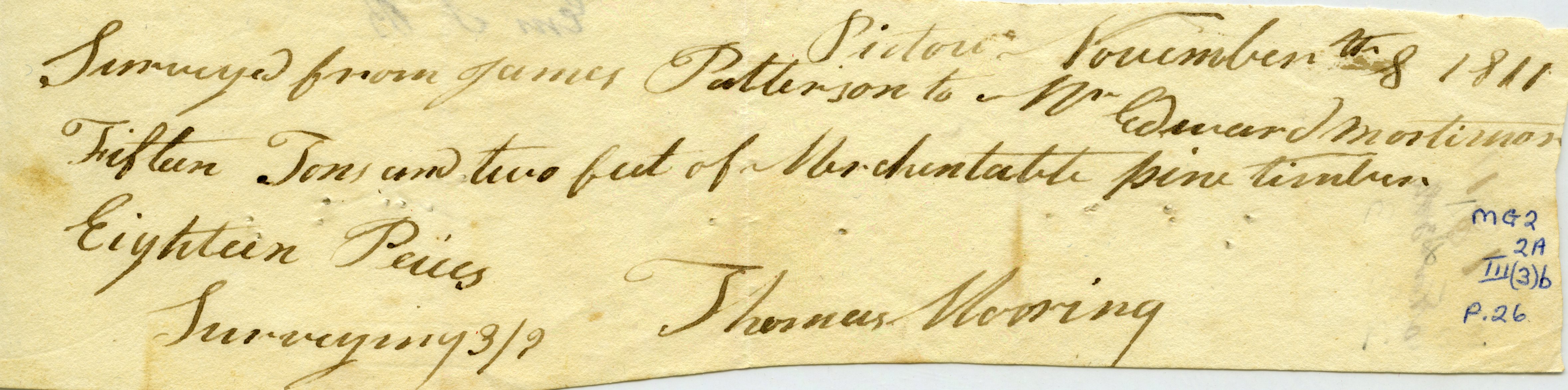 | Tags: | Patterson Papers, James Patterson, surveying, note, receipt, Thomas Mooring, Edward Mortimer, Pictou |