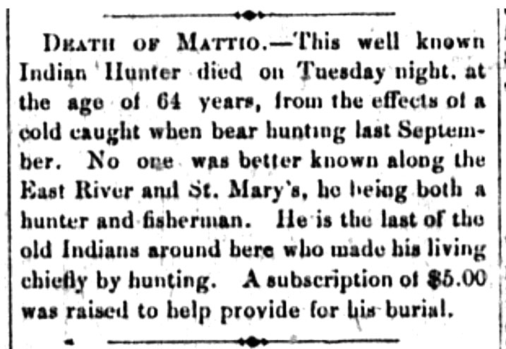 This well known Indian Hunter died on Tuesday night, at the age of 64 years, from the effects of a cold caught when bear hunting last September. No one was better known along the East River and St. Mary's, he being both a hunter and fisherman. He is the last of the old Indians around here who made his living chiefly by hunting. A subscription of $5.00 was raised to help provide for his burial.