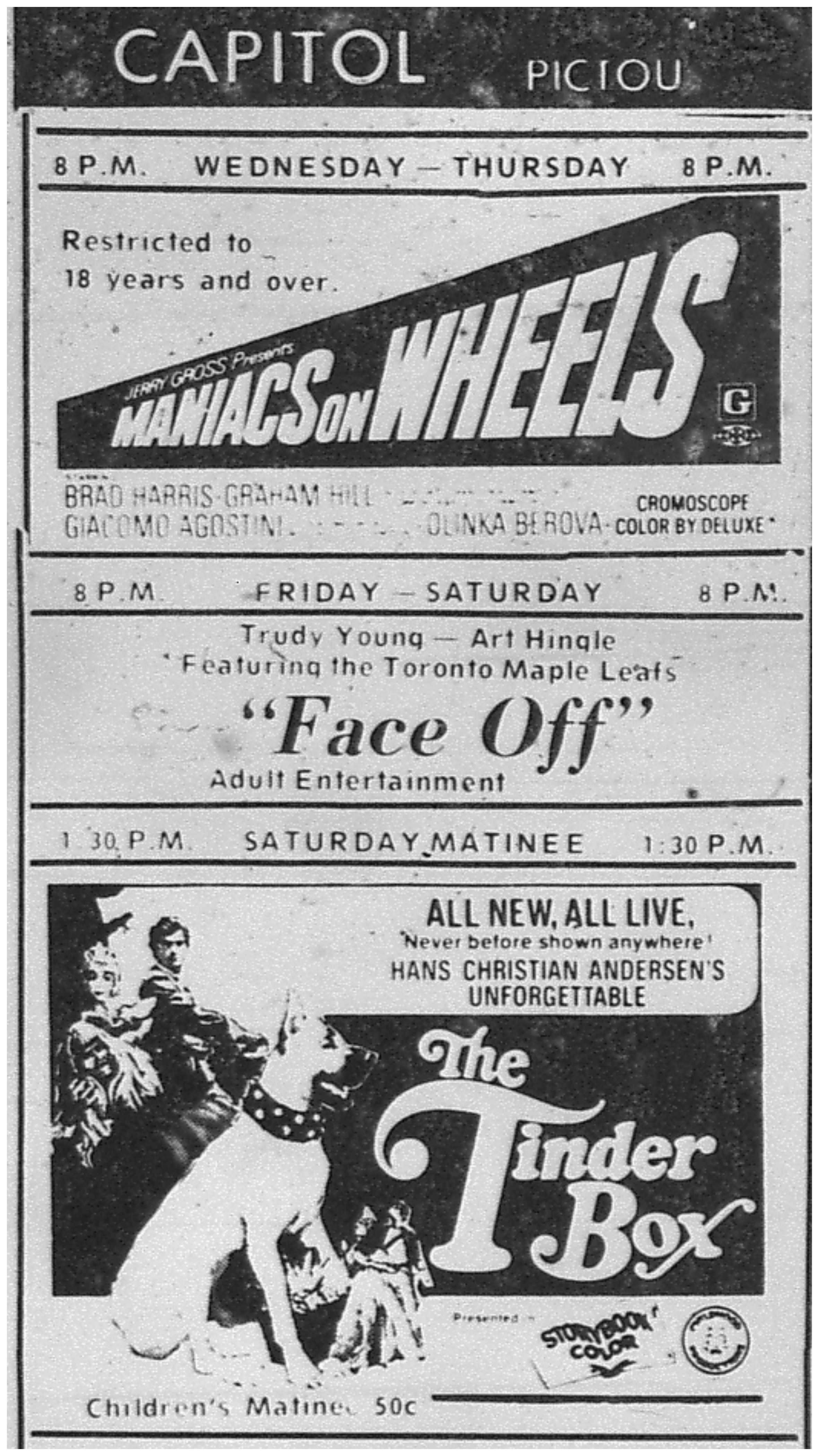Advertisement for films at Pictou's Capitol Theatre, featuring the films Maniacs on Wheels and The Tinder Box.