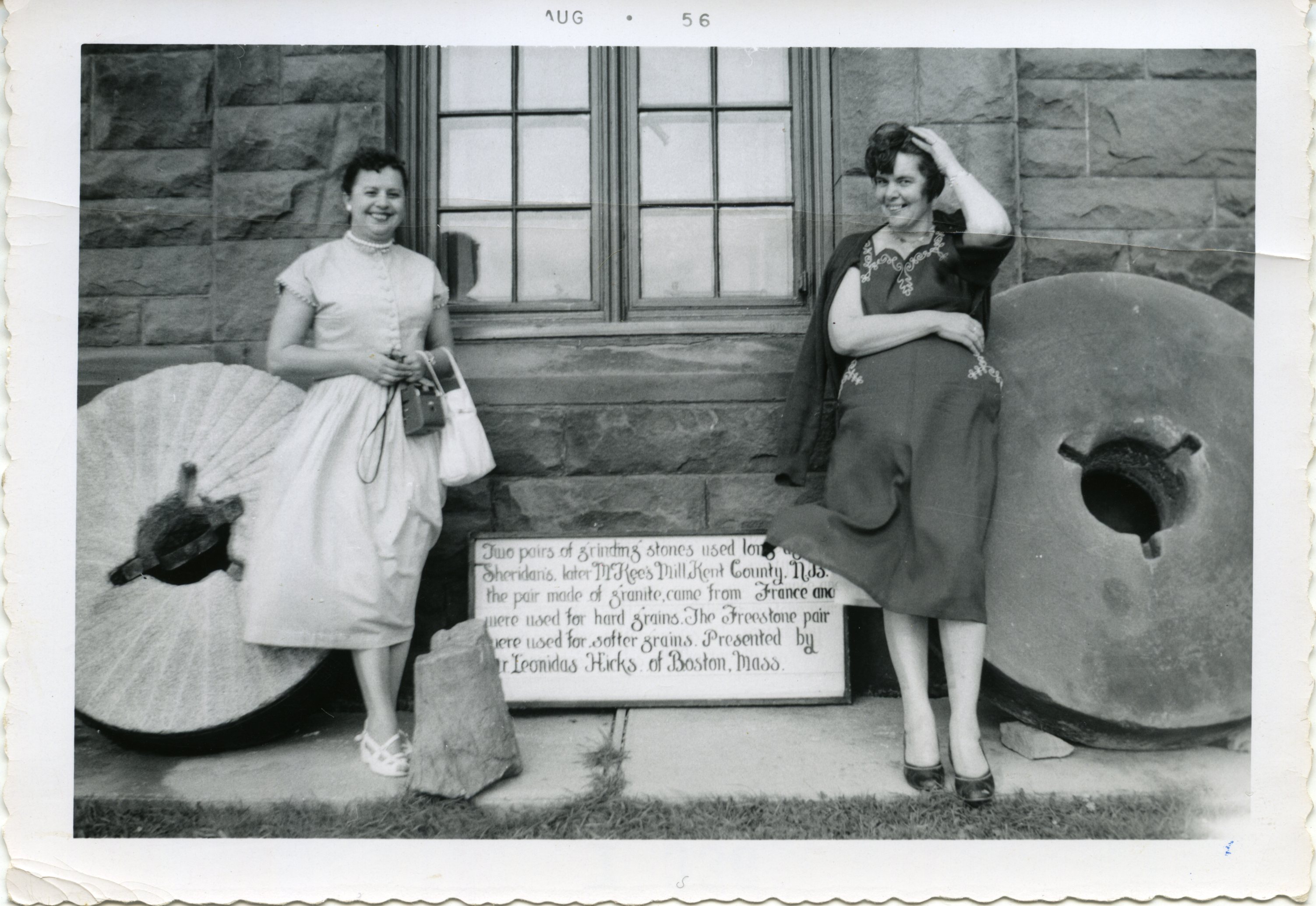 Bea MacIsaac and Emma Cheverie standing beside a pair of millstones from McKee’s Mills in Kent County, New Brunswick, August 1956.