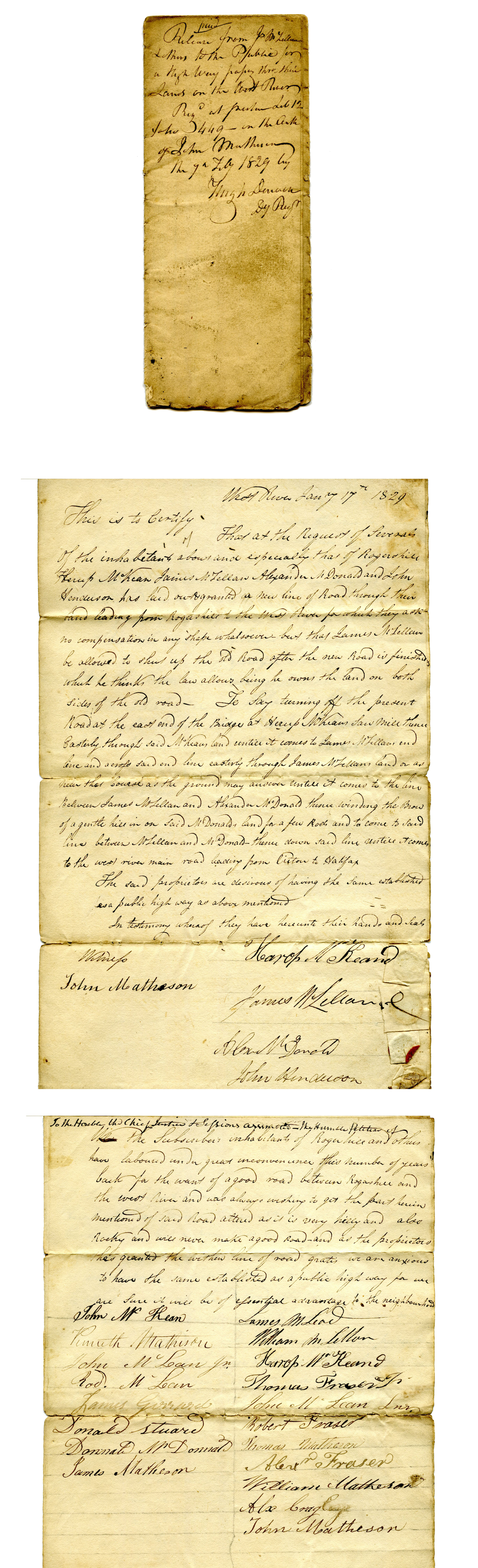 That at the request of several of the inhabitants about and especially those of Rogers Hill Herup McKean, James M’Lellan, Alexander M’Donald and John Henderson has laid out & granted a new line of road through their land leading from Rogers Hill to the West River for which they ask no compensation in any shape whatsoever but that James M’Lellan be allowed to shut up the old road after the new road is finished which he thinks the law allows being he owns the land on both sides of the old road. To say turning off the present road at the east end of the bridge at Herup M’Keans saw mill thence easterly through said McKeans land until it comes to James M’Lellans end line and across said end line easterly thought James M’Lellans land or as new that course as the ground may answer until it comes to the line between James M’Lellan and Alexander McDonald thence winding the brow of a gentle hill in on said McDonlds land for a few rods and to come to said line between M’Lellan and McDonald thence down said line until it comes to the west river main road leading from Pictou to Halifax