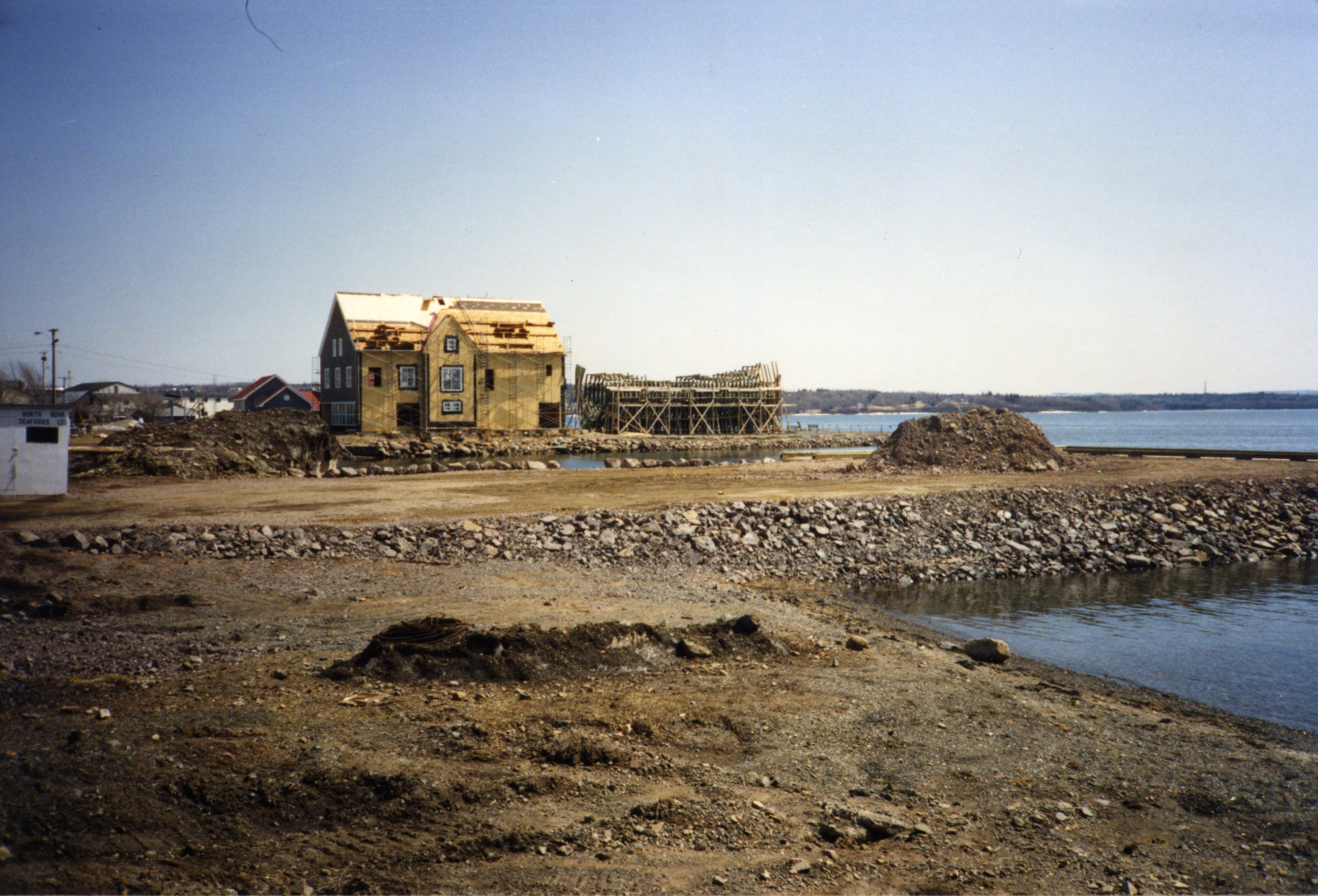 Photo of the Hector Heritage Quay under construction in the late 1980s/early 1990s, the ship Hector behind it during its construction.