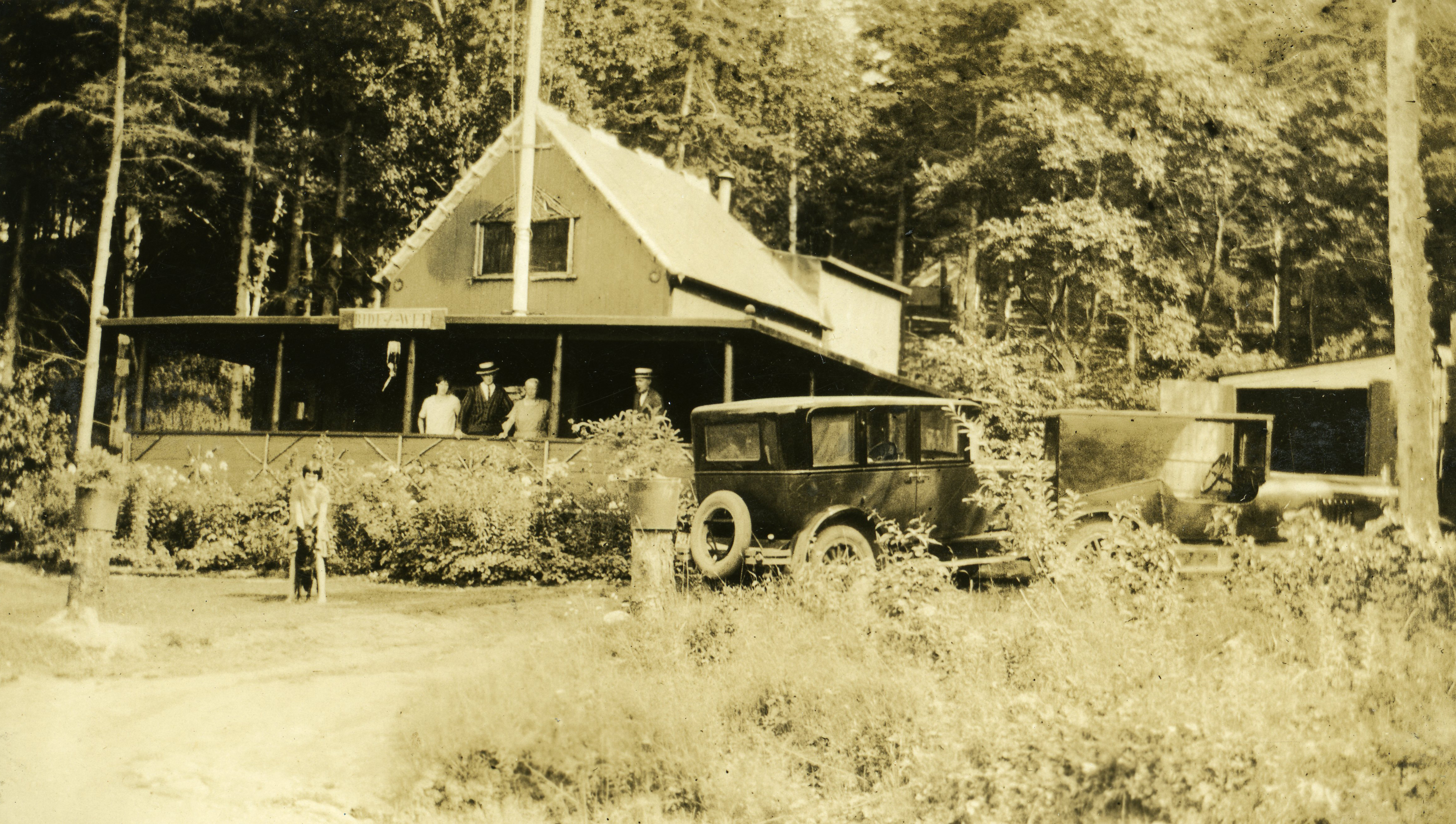 Group gathered on veranda of Bideawee Cottage, Pictou Landing. Owned by J Ed Macdonald