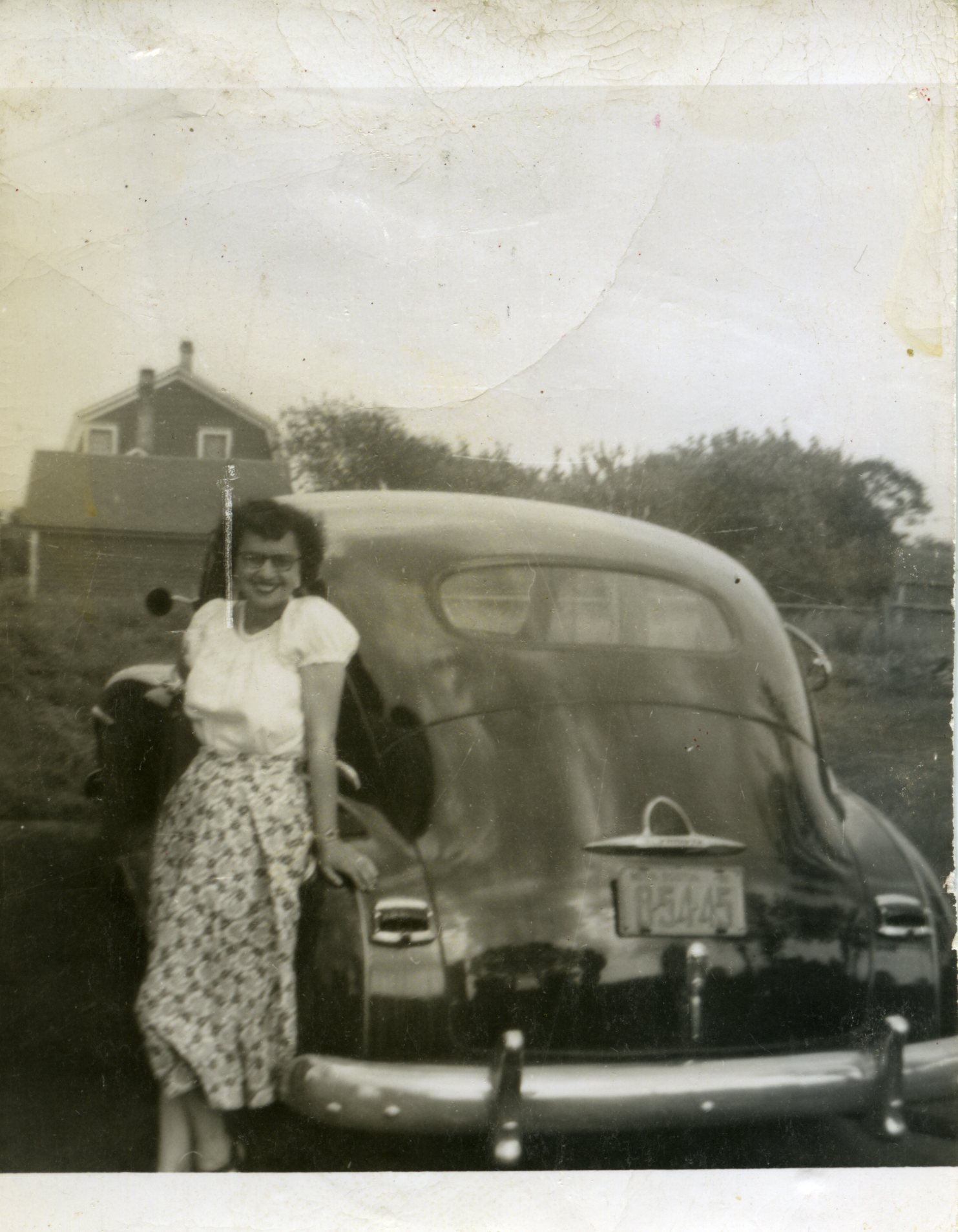 Photo of Bea MacIsaac (born Bourgeois) leaning against her husband, Don MacIsaac's car near a fence