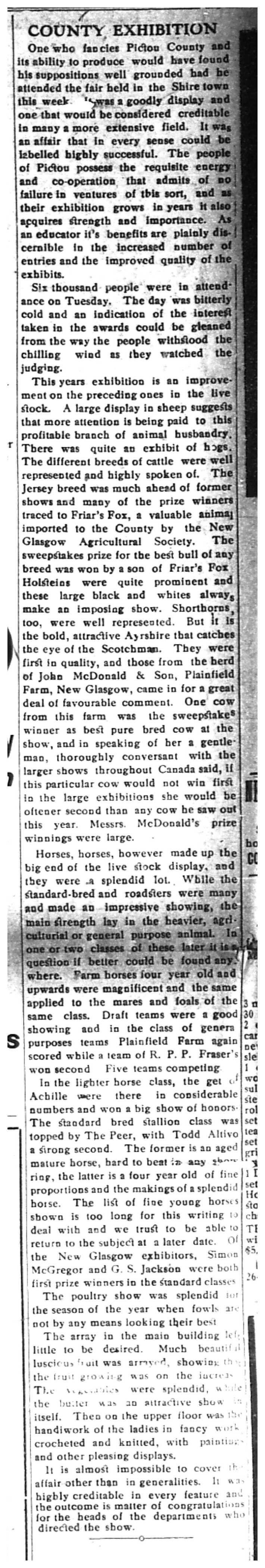 This years exhibition is an improvement on the preceding ones in the live stock. A large display in sheep suggests that more attention is being paid to this profitable branch of animal husbandry. There was quite an exhibit of hogs. The different breeds of cattle were well represented and highly spoken of. The Jersey breed was much ahead of former shows and many of the prize winners traced to Friar’s Fox, a valuable animal imported to the County by the New Glasgow Agricultural Society. The sweepstakes prize for the best bull of any breed was won by a son of Friar’s Fox Holsteins were quite prominent and these large black and whites always make an imposing show. Shorthorns, too, were well represented. But it is the bold, attractive Ayrshire that catches the eye of the Scotchman. They were first in quality, and those from the herd of John McDonald & Son, Plainfield Farm, New Glasgow, came in for a great deal of favourable comment. One cow from this farm was the sweepstakes winner as best pure bred cow at the show, and in speaking of her a gentleman, thoroughly conversant with the larger shows throughout Canada said, if this particular cow would not win first in the large exhibitions she would be oftener second than any cow he saw out this year. Messrs. McDonald’s prize winnings were large.