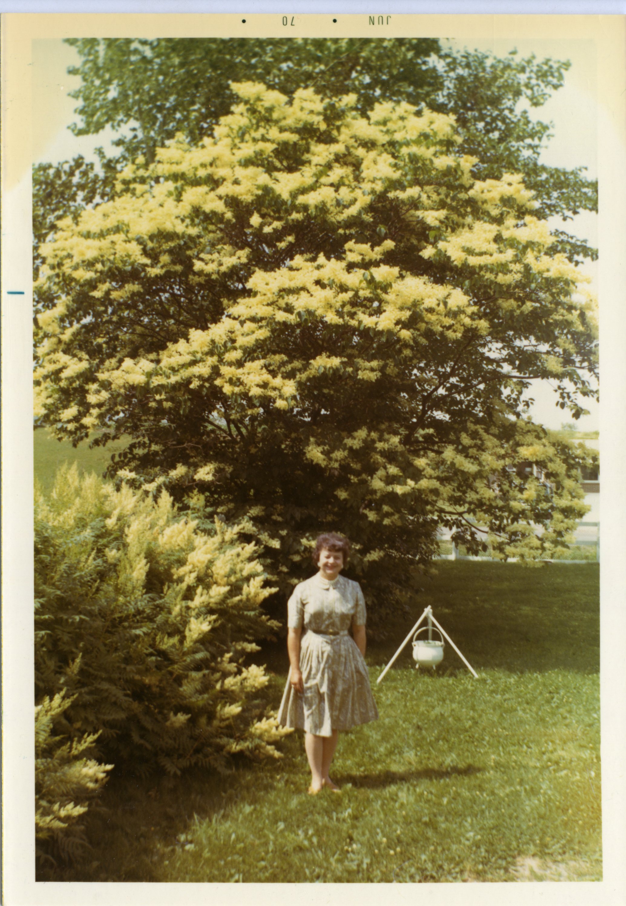 Bea MacIsaac in her backyard by a Japanese silk lilac tree, which was planted in the 1930s. The tree was later featured in the Chronicle Herald (and local papers) in 2004 when it bloomed and grew at a fast rate following Hurrican Juan. The hurricane knocked down a neighbouring tree that was shading the lilac, effectively stunting its growth. The tree is still on the property as of 2017.