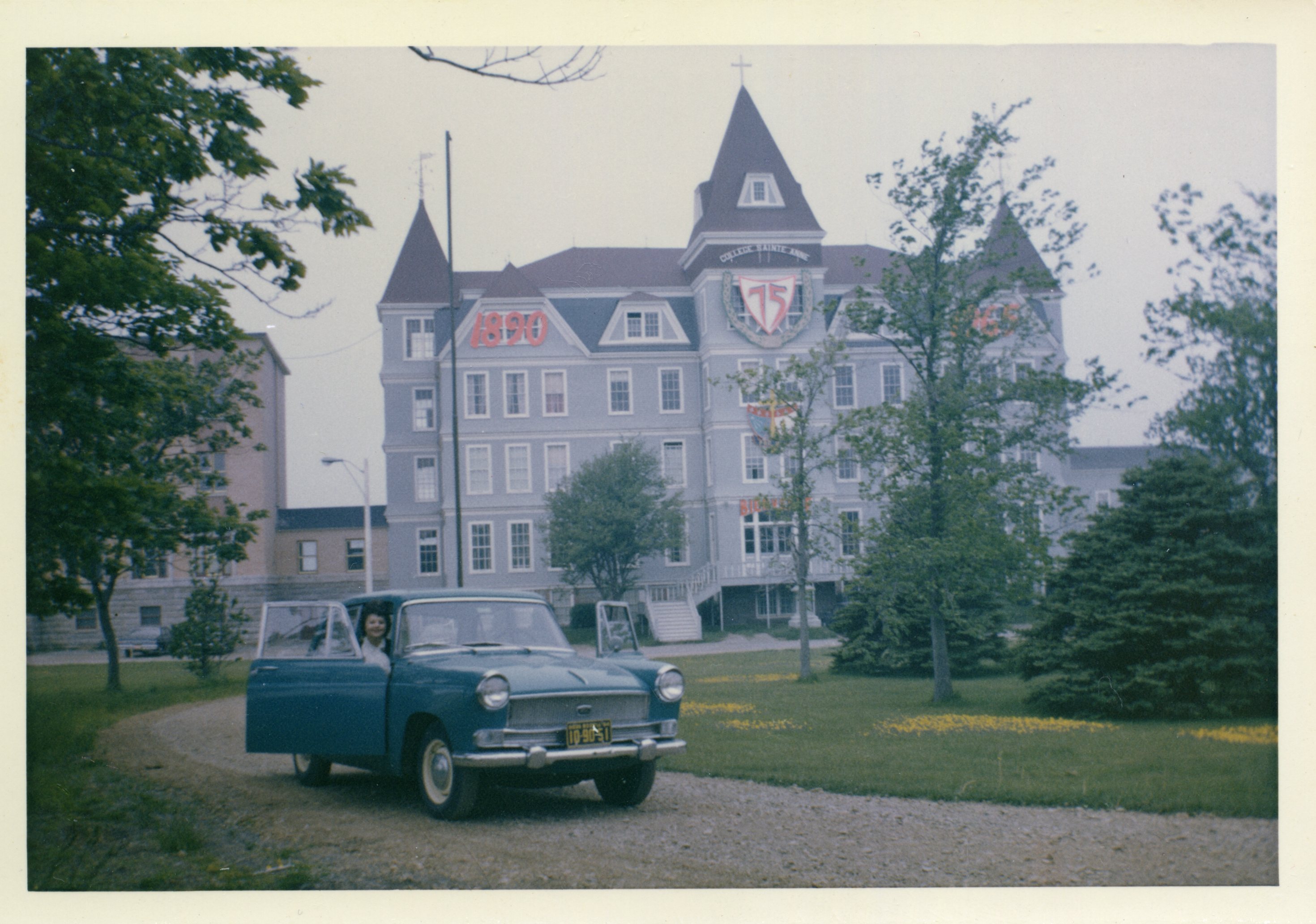 Bea MacIsaac sitting inside the car in front of the College Sainte Anne, celebrating its 75th year in 1965