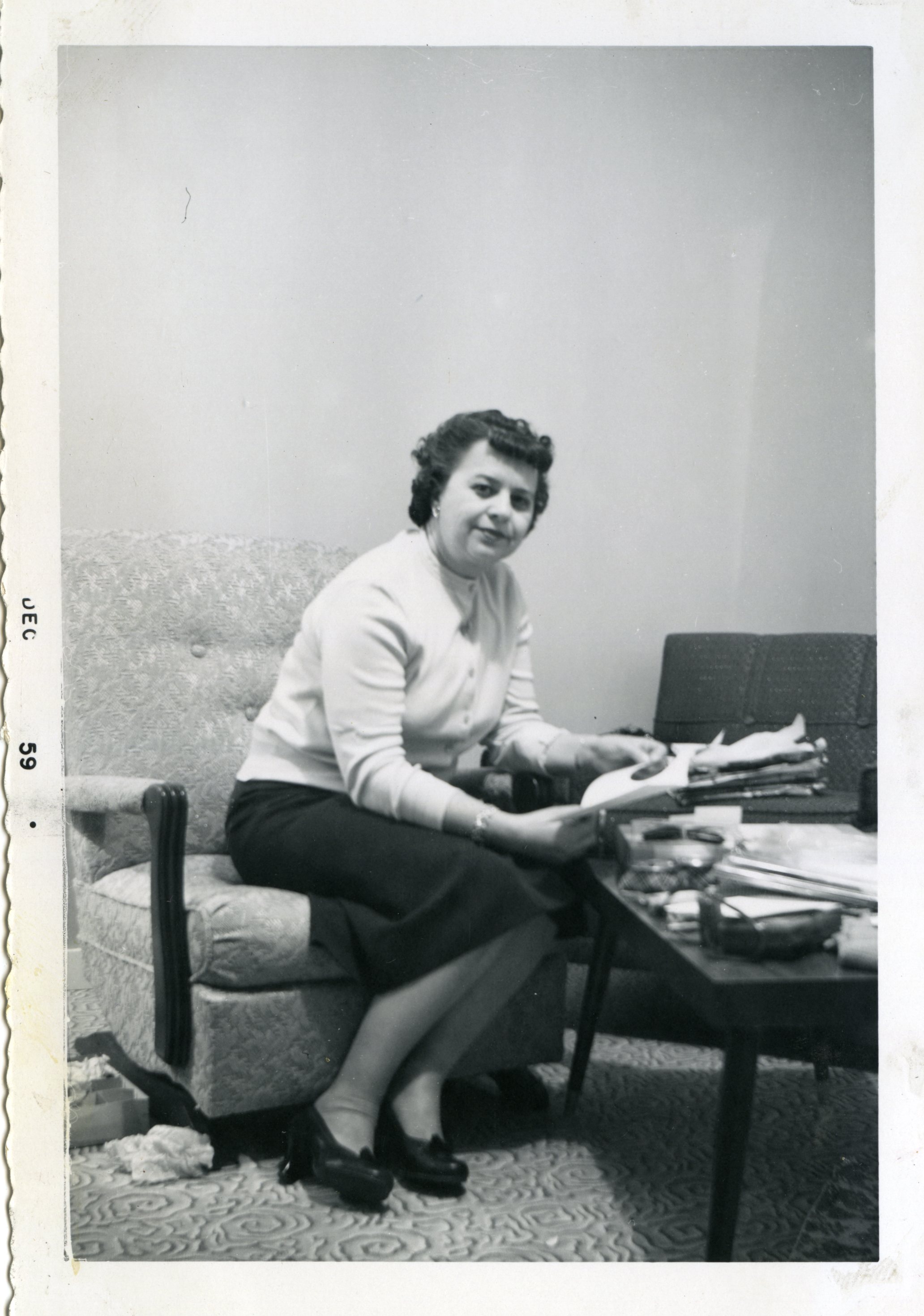 Bea MacIsaac, née Bourgeois, reading, about December 1959