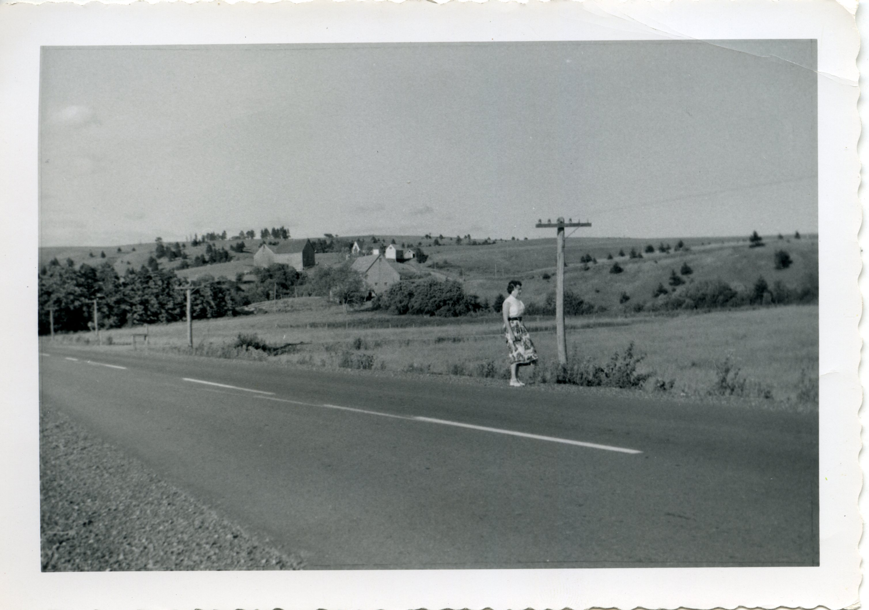 Bea MacIsaac standing on the shoulder, farms in the background
