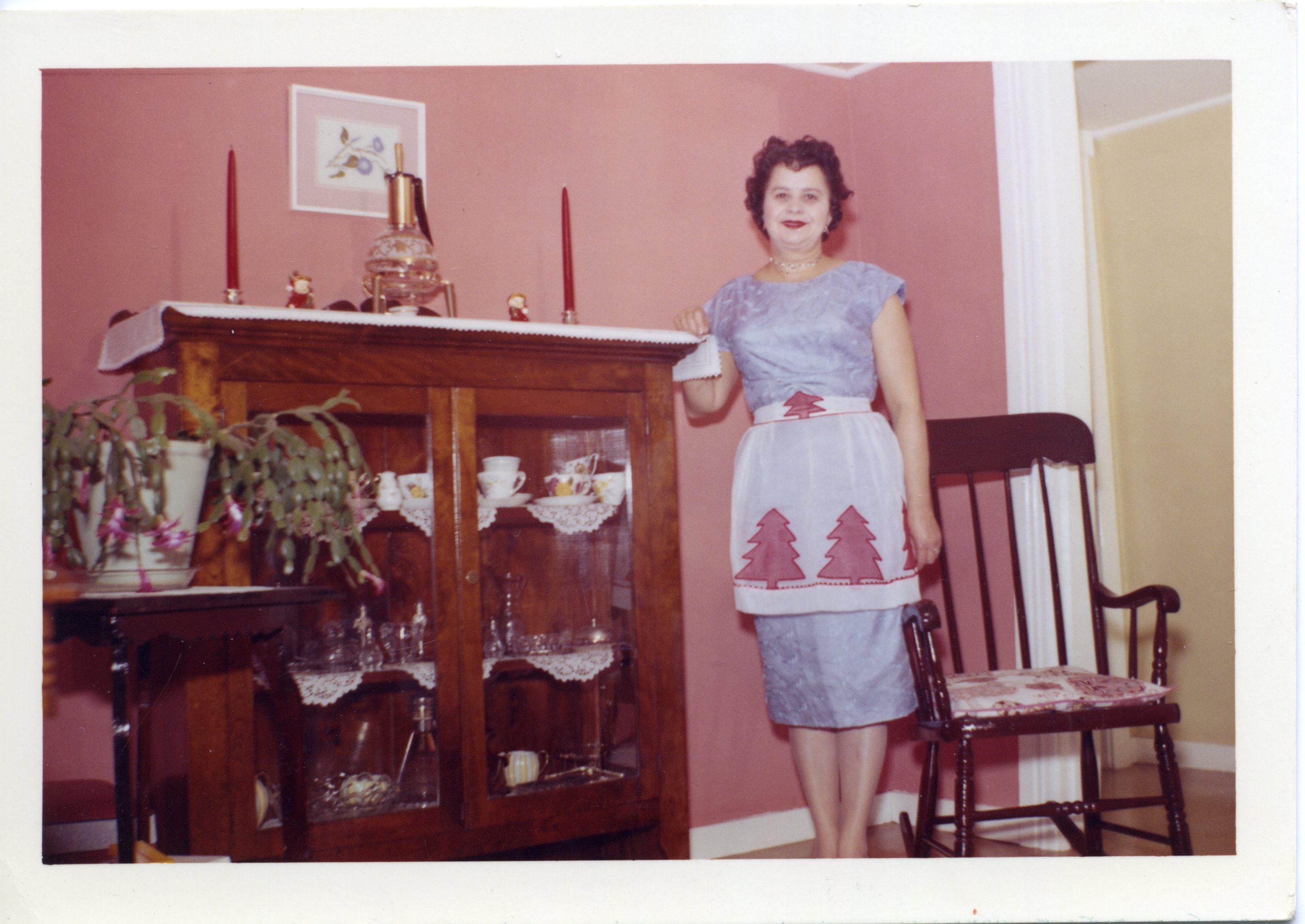 Bea MacIsaac standing by a china cupboard at Christmas time
