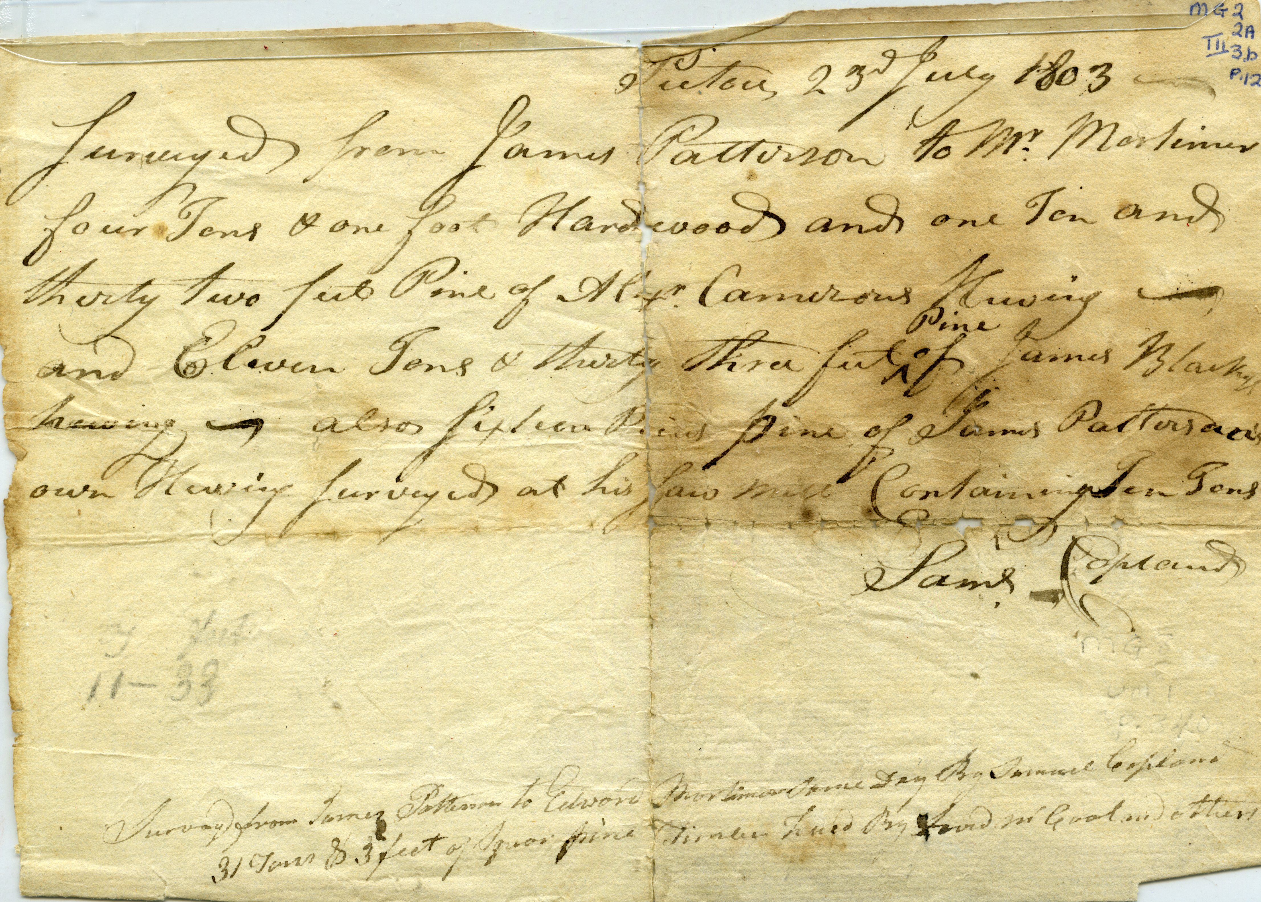 Surveyed from James Patterson to Mr. Mortimer four tons and one foot hardwood and one ton and thirty two feet pine of Alexander Cameron's [newing?] __