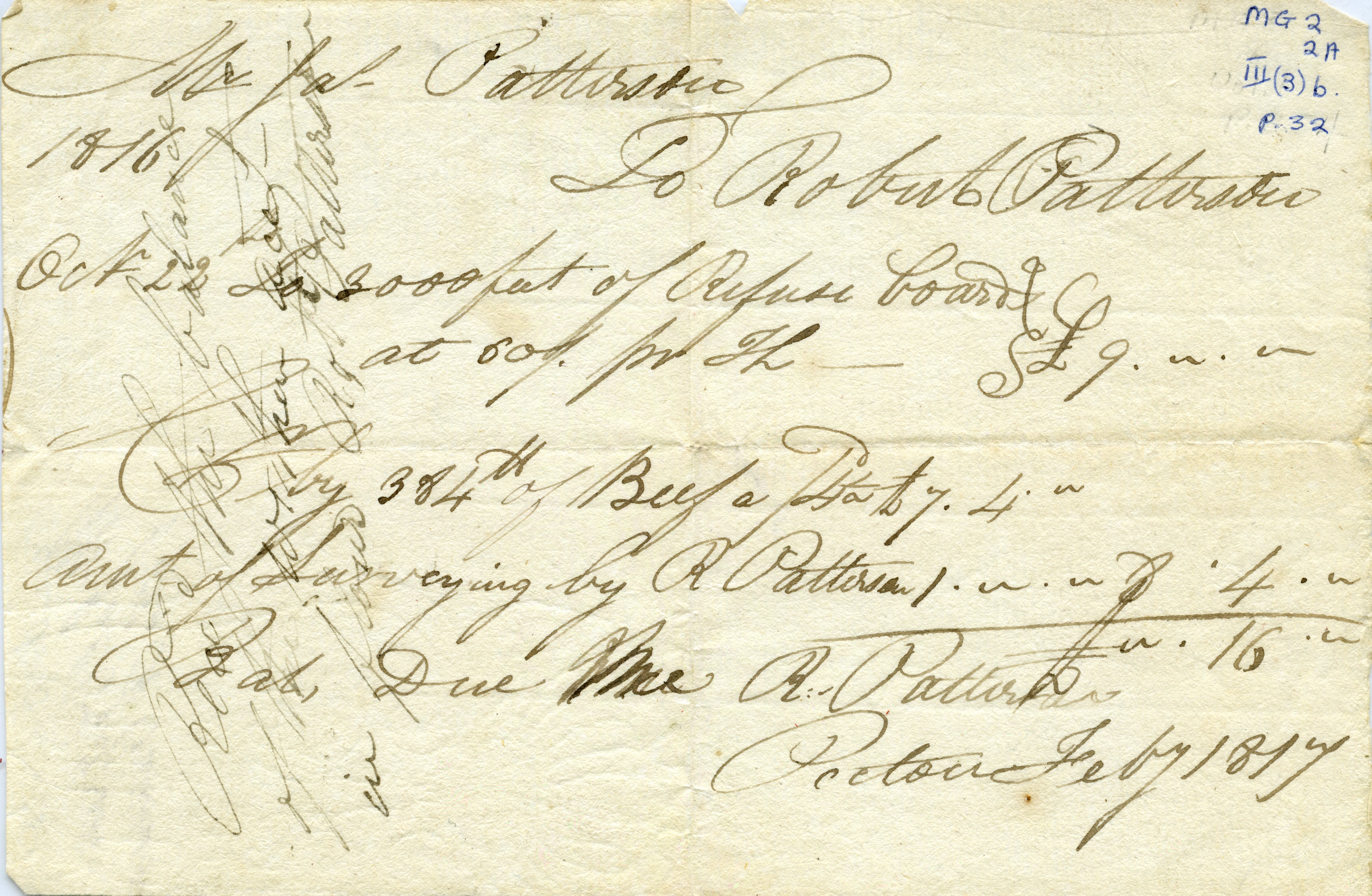 Bill for James Patterson from Robert Patterson, dated in Pictou, Feb. 1817, concerning surveyed boards from Oct. 22nd, 1816