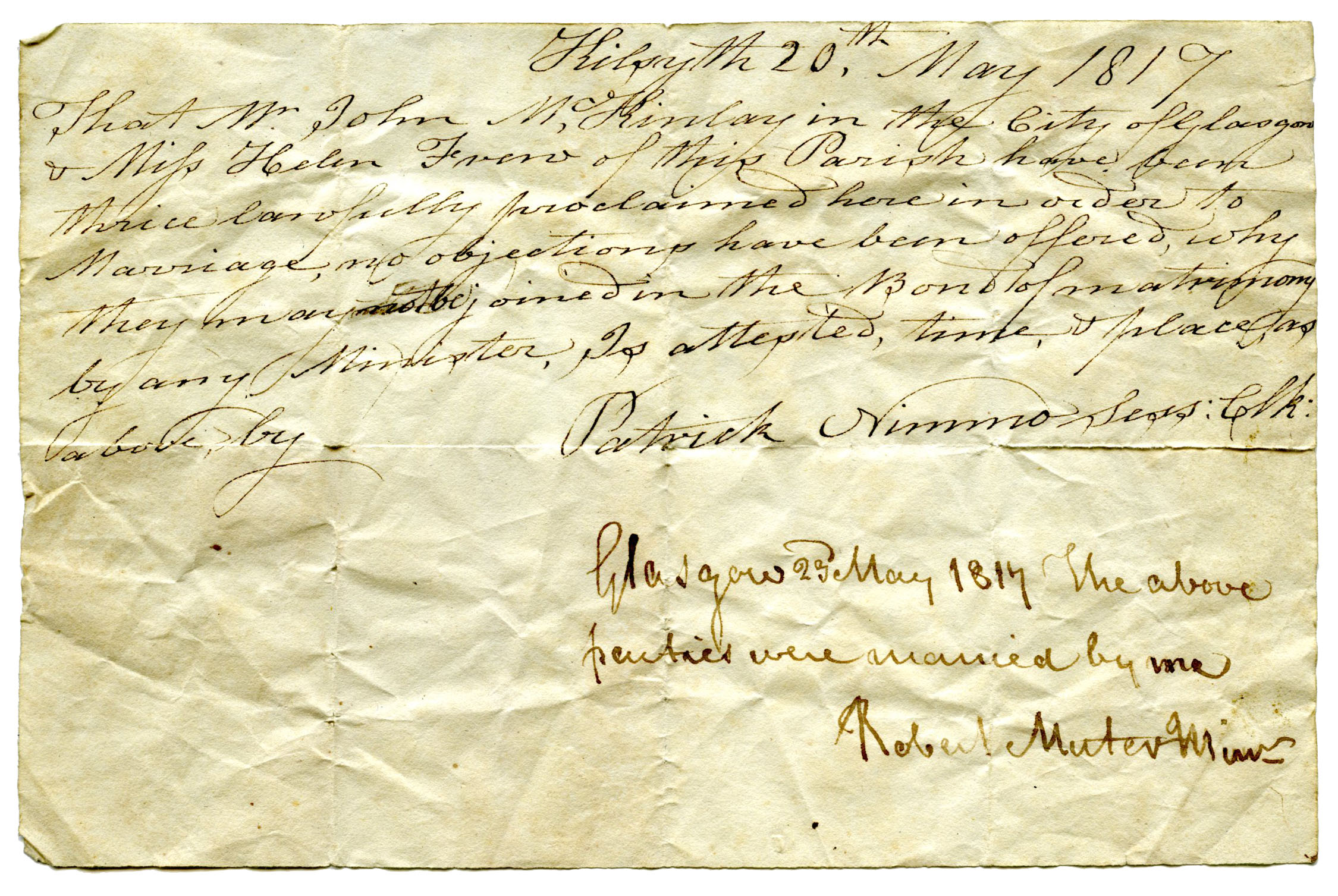 That Mr. John McKinlay in the City of Glasgow & Miss Helen Frew of this Parish have been thrice lawfuly proclaimed here in order to Marriage, no objections have been offered why they may not be joined in the Bond of matrimony by any Minister, Is attested, time & place as above by