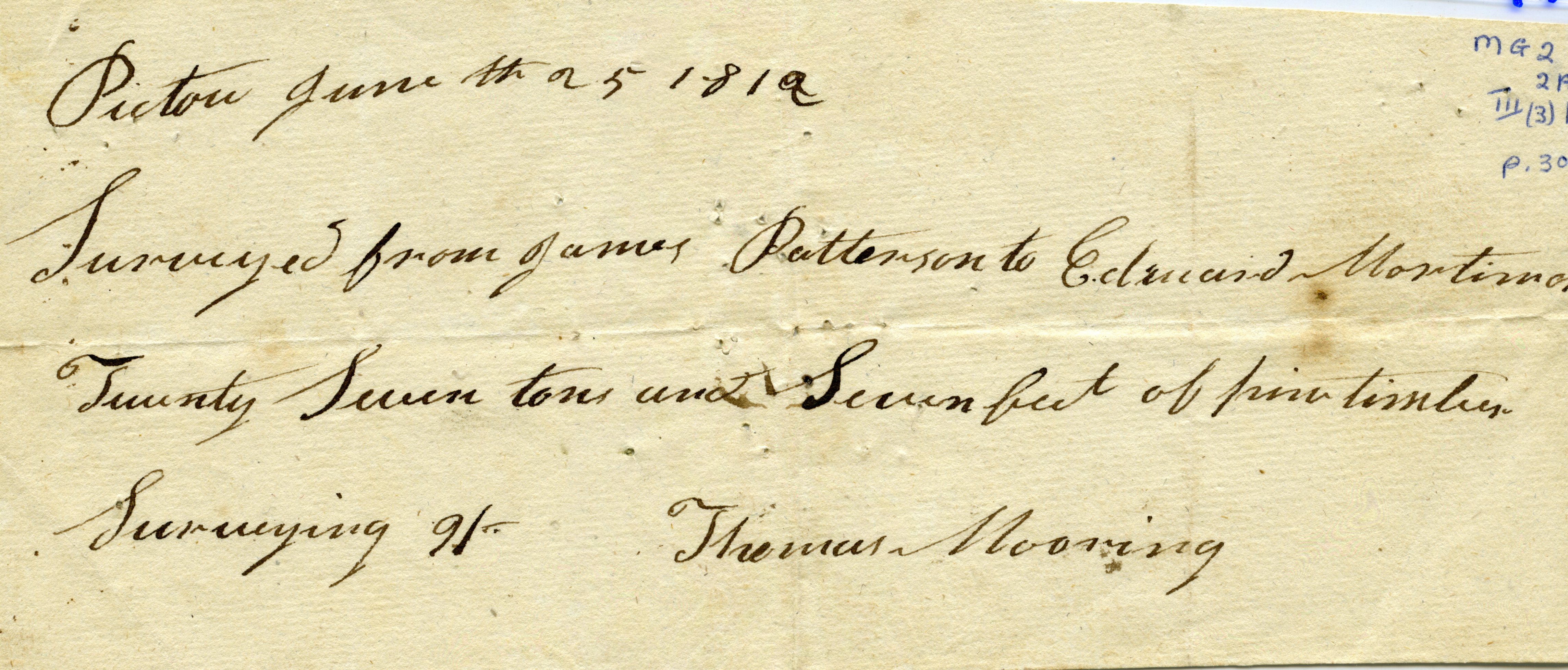 Surveyed from James Patterson to Edward Mortimer Twenty Seven tons and Seven feet of pine timber.