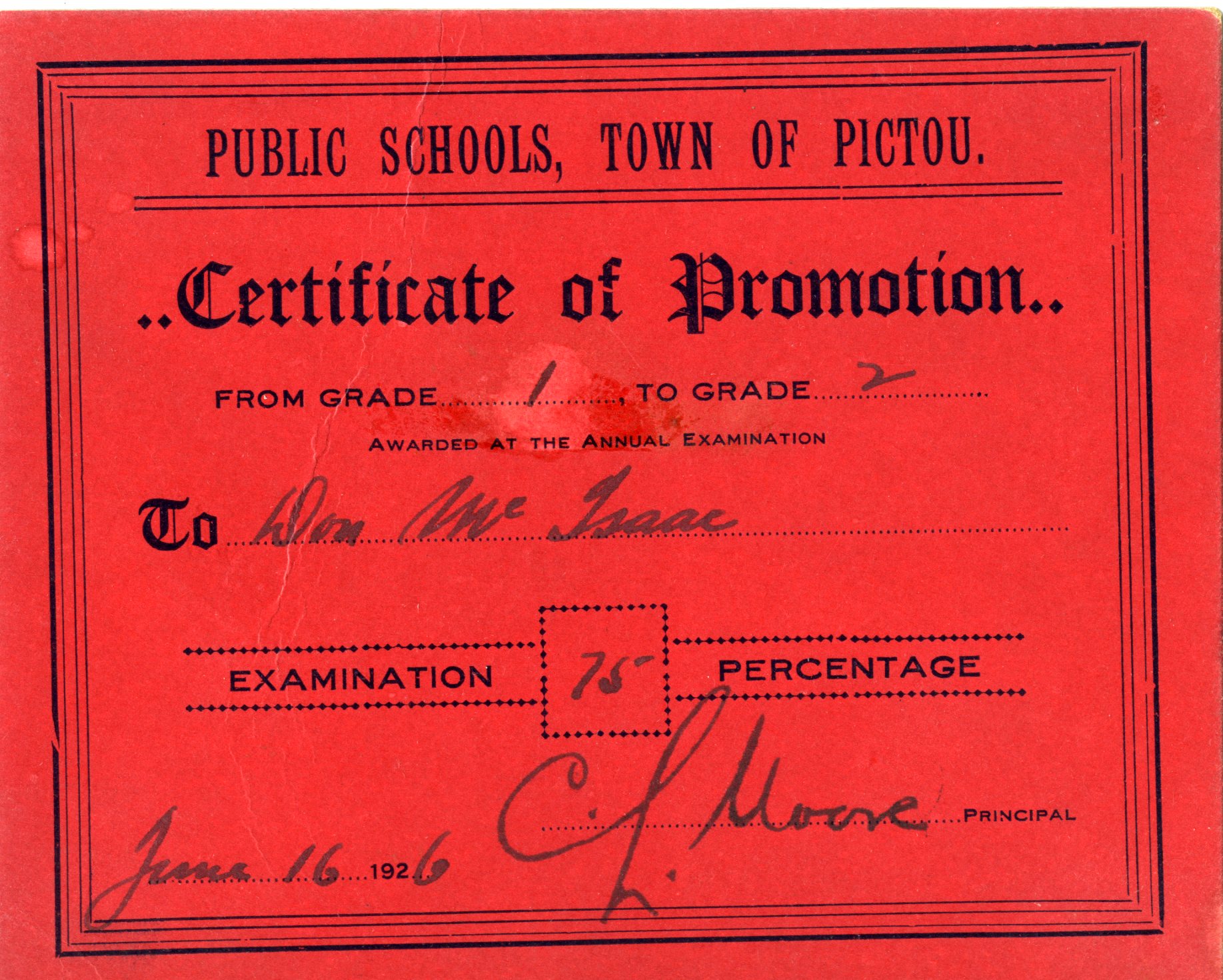 Certificate of Promotion from grade 1 to grade 2 for Don MacIsaac, from June 16, 1926 in the town of Pictou. Signed by C.L. Moore.