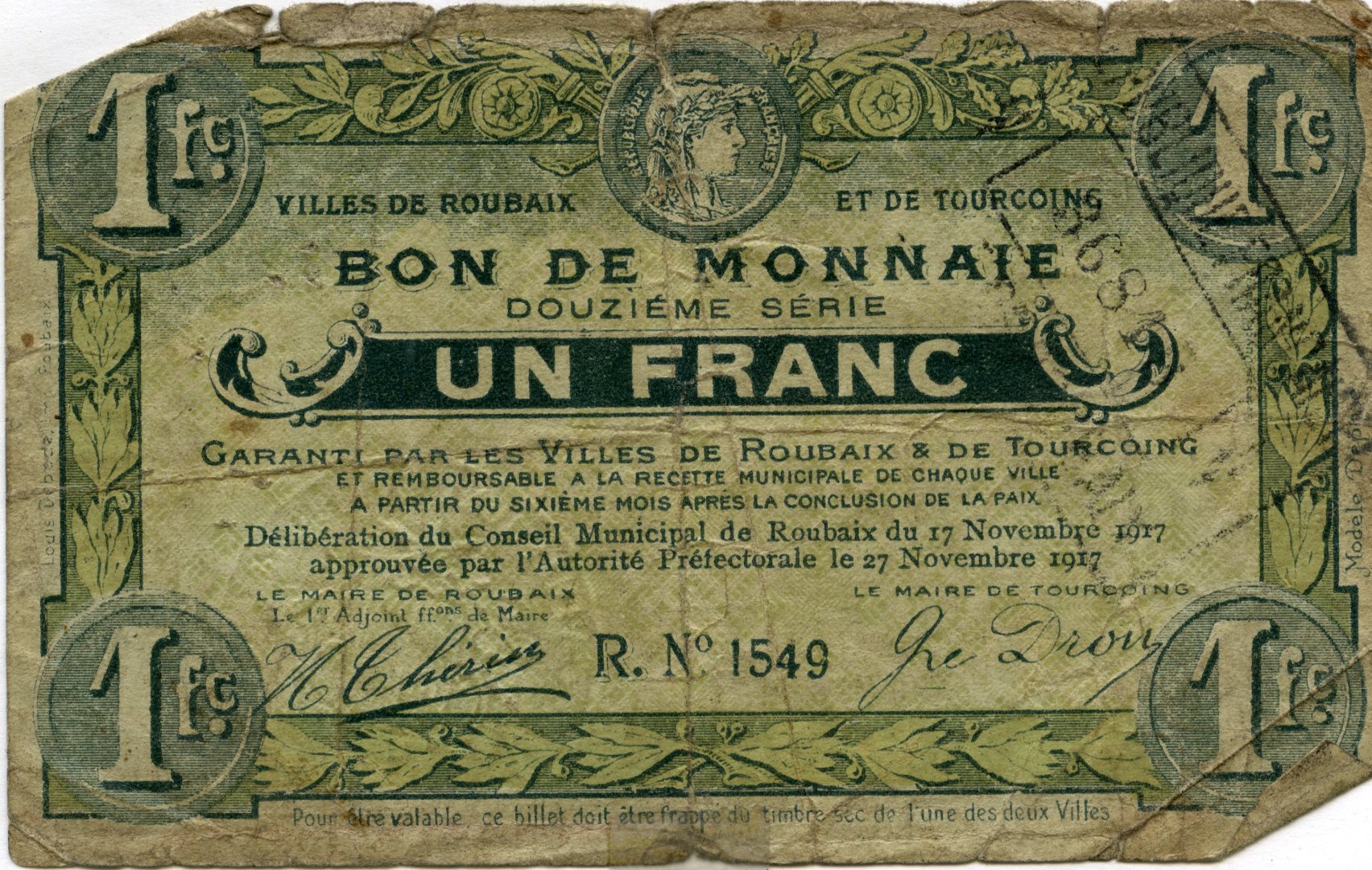 Banknote from France (for the cities of Roubaix and Tourcoing) of 1 Franc, printed in November 1917