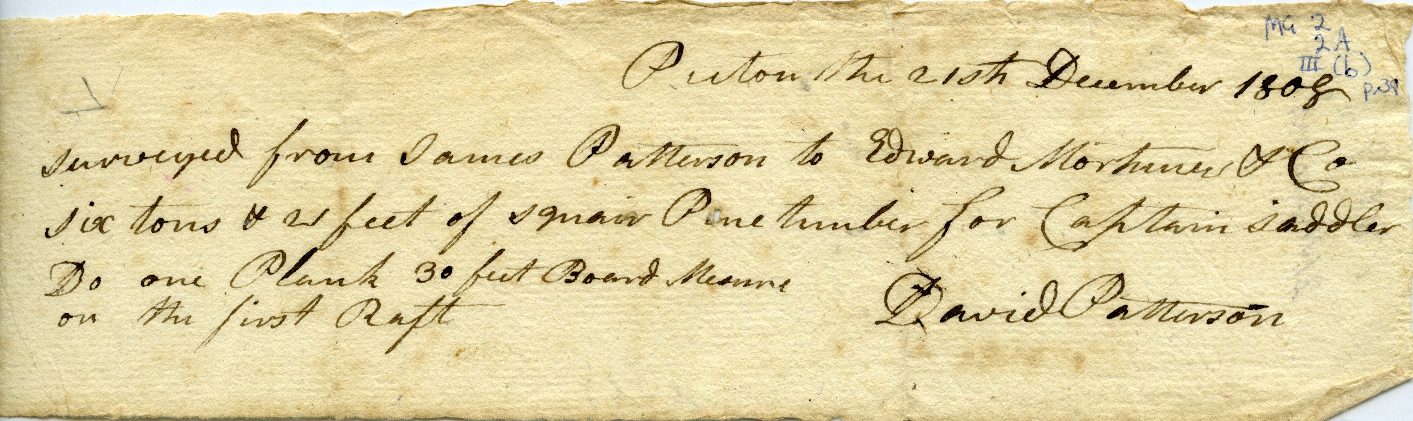 Surveyed from James Patterson to Edward Mortimer & Co. six tons and 21 feet of [spruce?] Pine timber for Captian saddler.