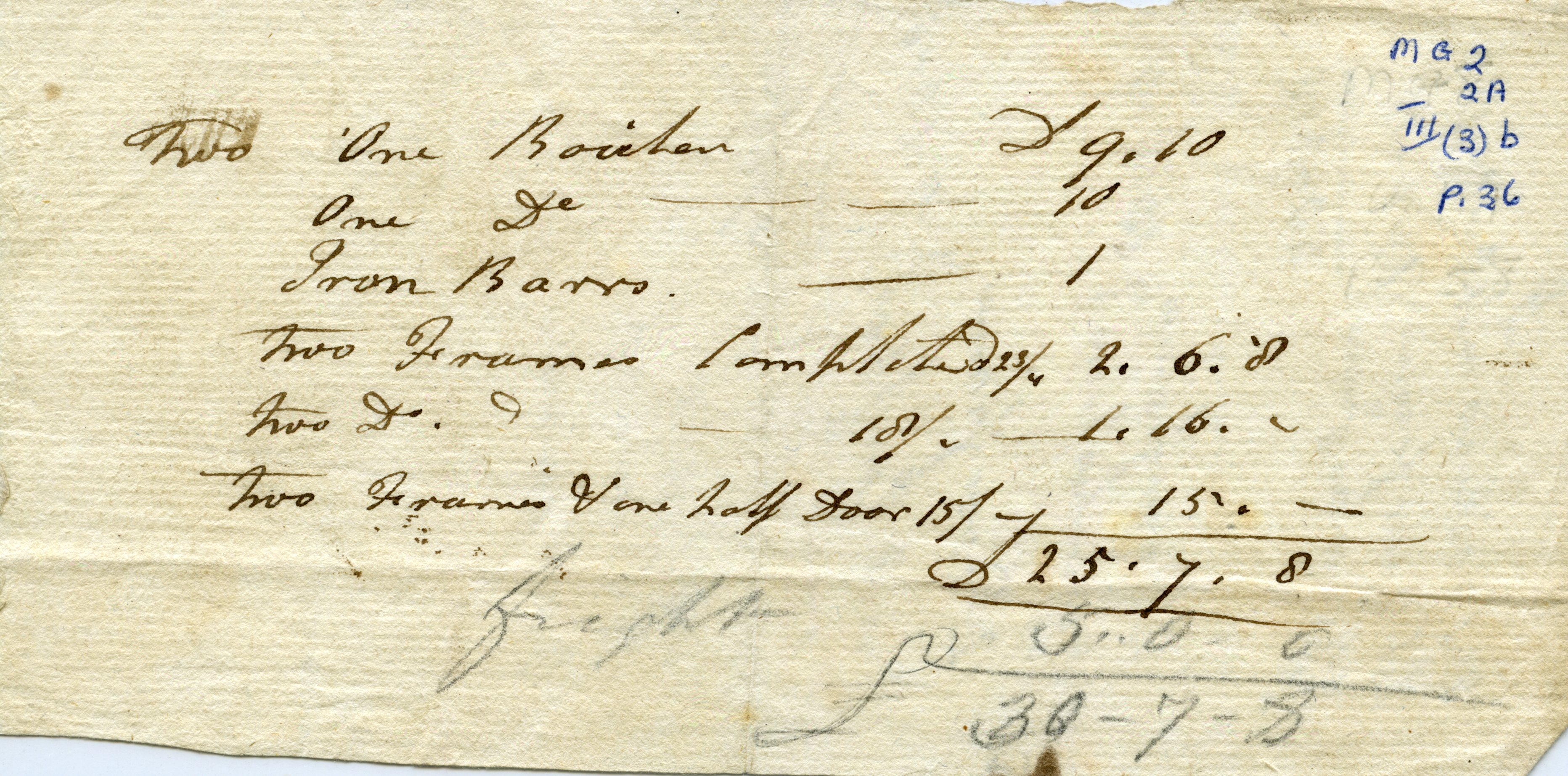 List of items bought from the James Patterson papers. Includes iron bars, frames, and doors.