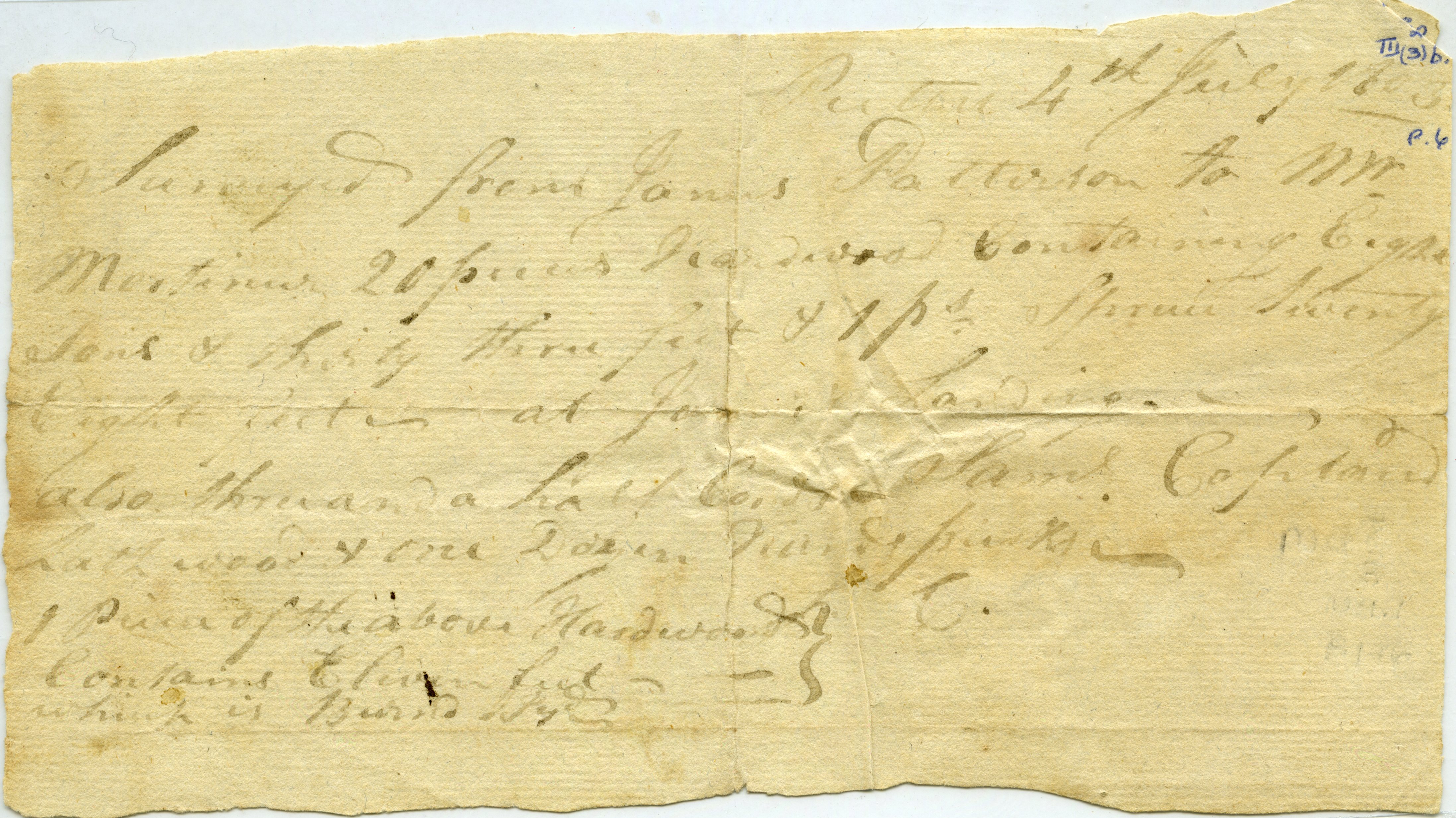 Surveyed from James Patterson to Mr. Mortimer 20 pieces hardwood containing eight tons and thirty three feet and 1 ps. spruce seventy eight feet at [James Landing?]. Also three and a half [cords?] lathwood and one dozen [handprints?] 1 peice of the above hardwood contains eleven feet which is board [...?]