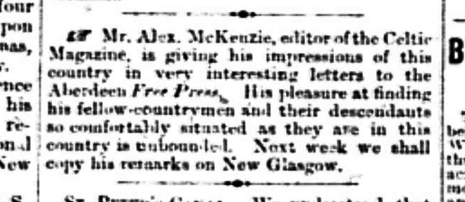"Mr. Alex. McKenzie, editor of the Celtic Magazine, is giving his impressions of this country in very interesting letters to the Aberdeen Free Press. His pleasure at finding his fellow-countrymen and their descendants so comfortably situated as they are in this county is unbounded. Next week we shall copy his remarks on New Glasgow."