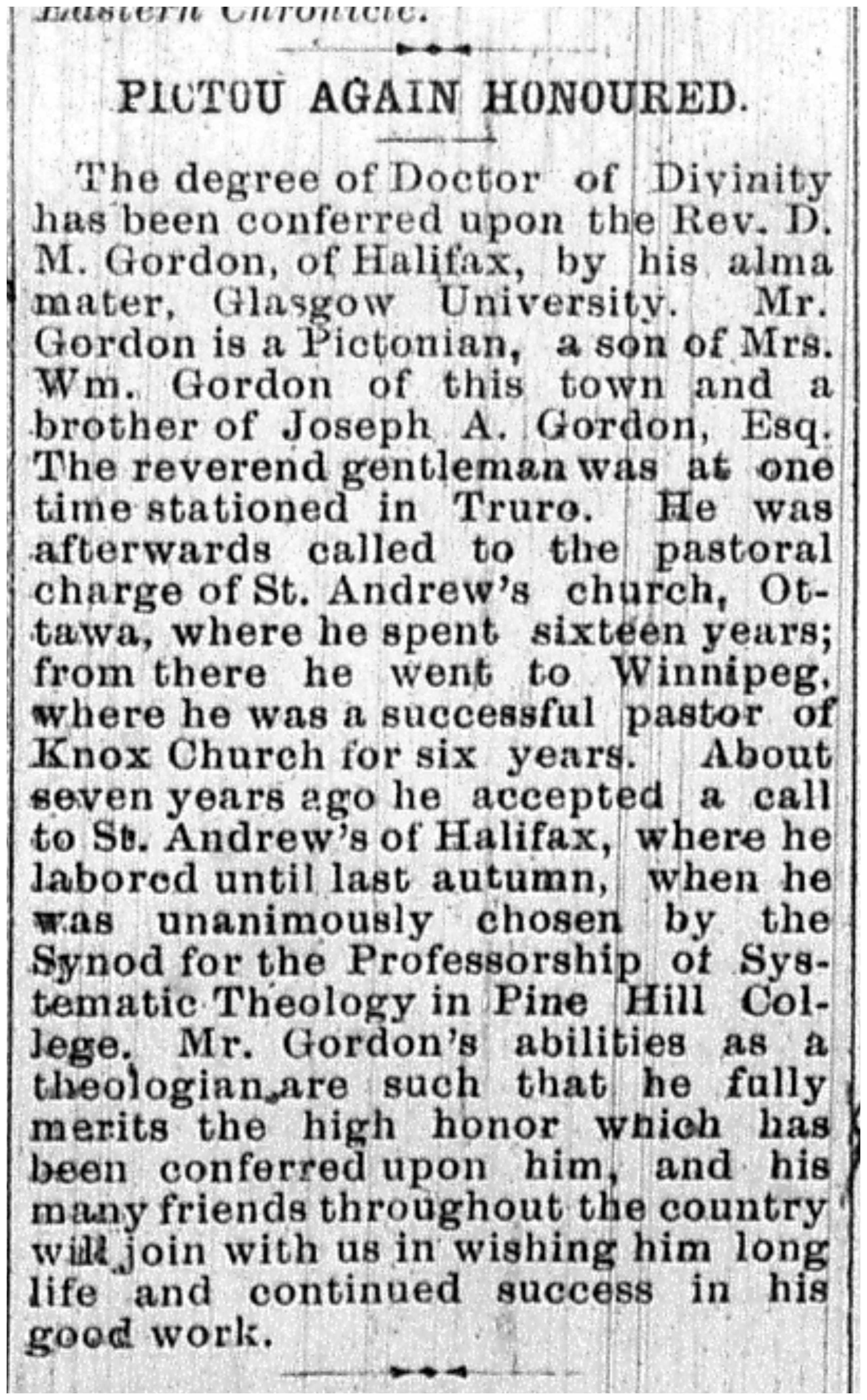The degree of Doctor of Divinity has been conferred upon the Rev. D. M. Gordon, of Halifax, by his alma mater, Glasgow University. Mr. Gordon is a Pictonian, a son of Mrs. Wm. Gordon of this town and a brother of Joseph A. Gordon, Esq. The reverend gentleman was at one time stationed in Truro. He was afterwards called to the pastoral charge of St. Andrew's church, Ottawa, where he spent sixteen years' from there he went to Winnipeg, where he was a successful pastor of Knox Church for six years. About seven years ago he accepted a call to St. Andrew's of Halifax, where he labored until last autumn, when he was unanimously chosen by the Synod for teh Professorship of Systematic Theology in Pine Hill College. Mr. Gordon's abilities as a thrologian are such that he fully merits the high honor which has been conferred upon him, and his many friends throughout the country will join with us in wishing him long life and coninuted success in his good work."