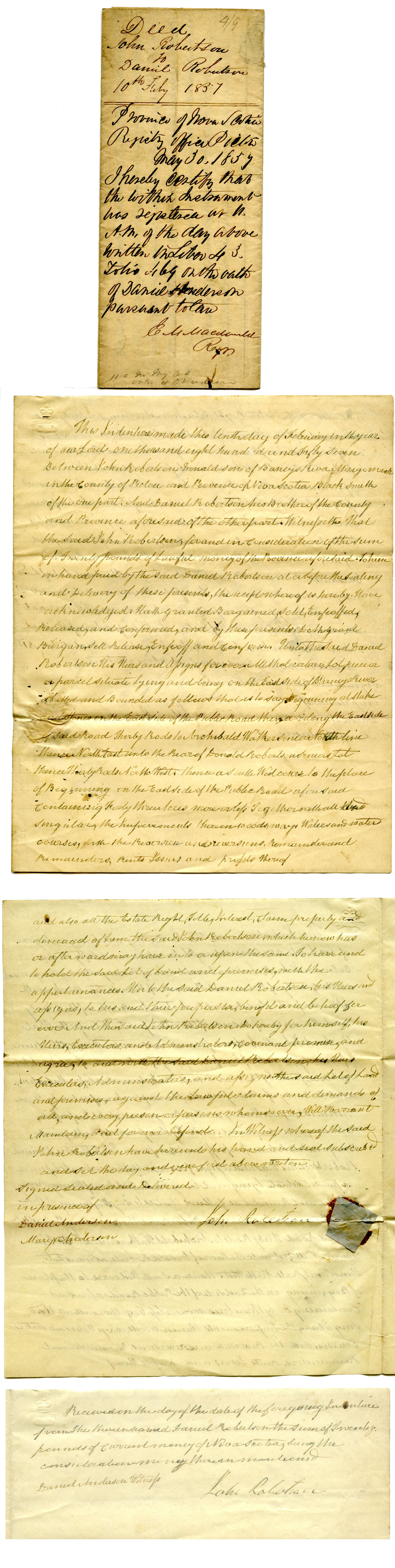 This Indenture made this tenth day of February in the year of our Lord one thousand eight hundred and Fifty seven between John Robertson Donald son of Barneys River, Merigomish in the County of Pictou and Province of Nova Scotia, Blacksmith of the one part And Daniel Robertson his Brother of the County and Province aforesaid of the other part. Witnesseth That the said John Robertson, for and in consideration of the sum of Twenty pounds of Lawful money of the Province aforesaid to him in hand paid by the said Daniel Robertson at or before the sealing and delivery of these presents, the receipt where of is hereby, Have acknowledged, Hath granted Bargained, sold, Enfeoffed, Released, and confirmed, and by these presents, doth grant Bargain, sell, Release, Enfeoff and confirm. Unto the said Daniel Robertson His Heirs and Assigns forever that certain lot piece or parcel situate lying and being on the East side of Barney's River abutted and Bounded as follows that is to say Beginning at stake and stones on the East side of the Public road there along the East side of said road Thirty rods to Archibald Walker Senior North line thence North East unto the rear of Donald Robertson Seniors Lot thence Thirty Rods North West thence a south West course to the place of Beginning on the East side of the Public road aforesaid containing Forty three acres more or less Together with all and singular, the Improvements thereon woods, ways, waters and water courses, with the river--- and rivers---, remainder and remainders, rents issues and profits thereof